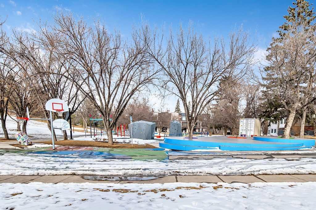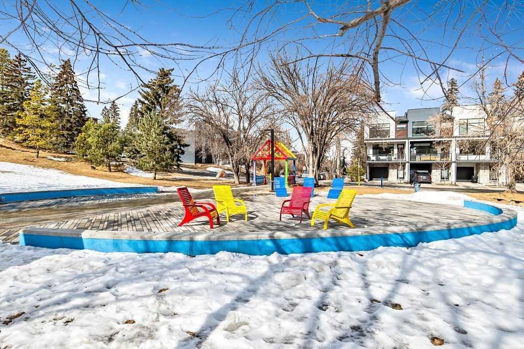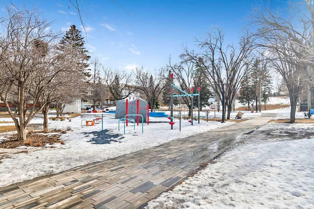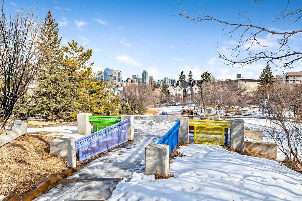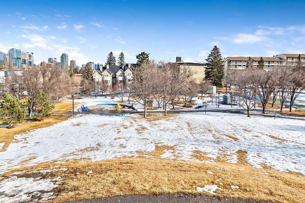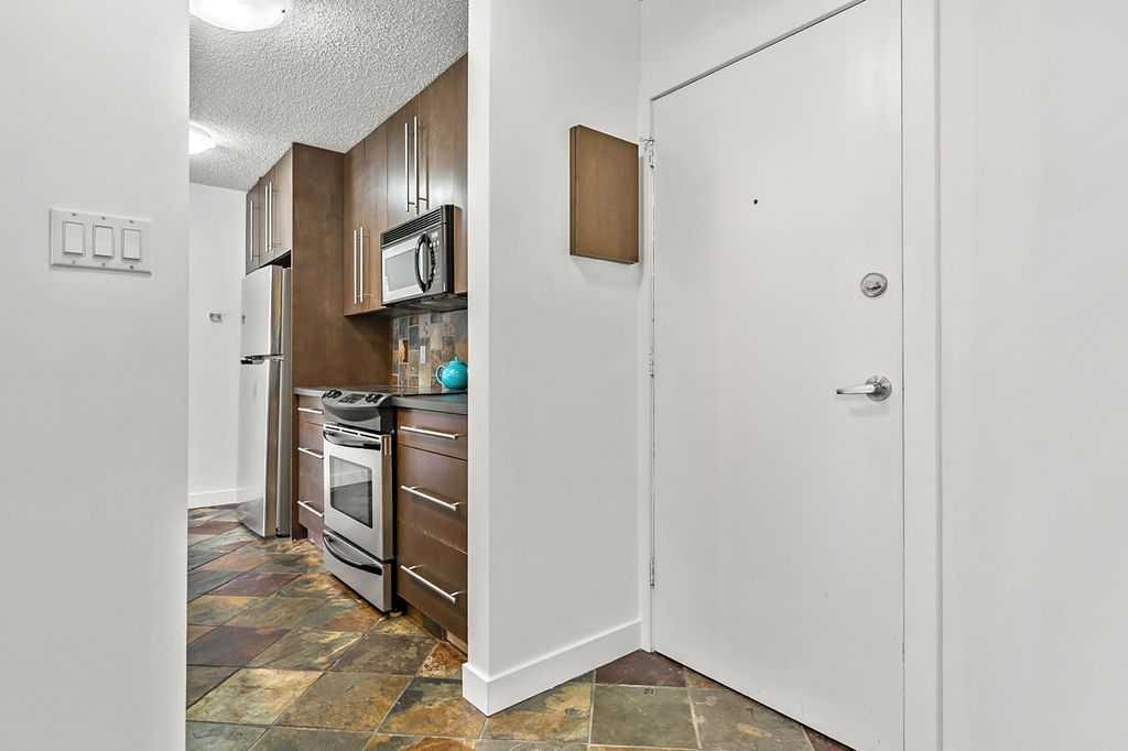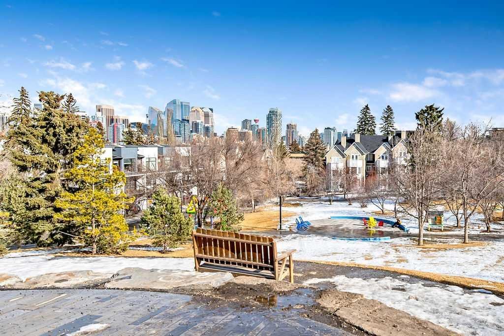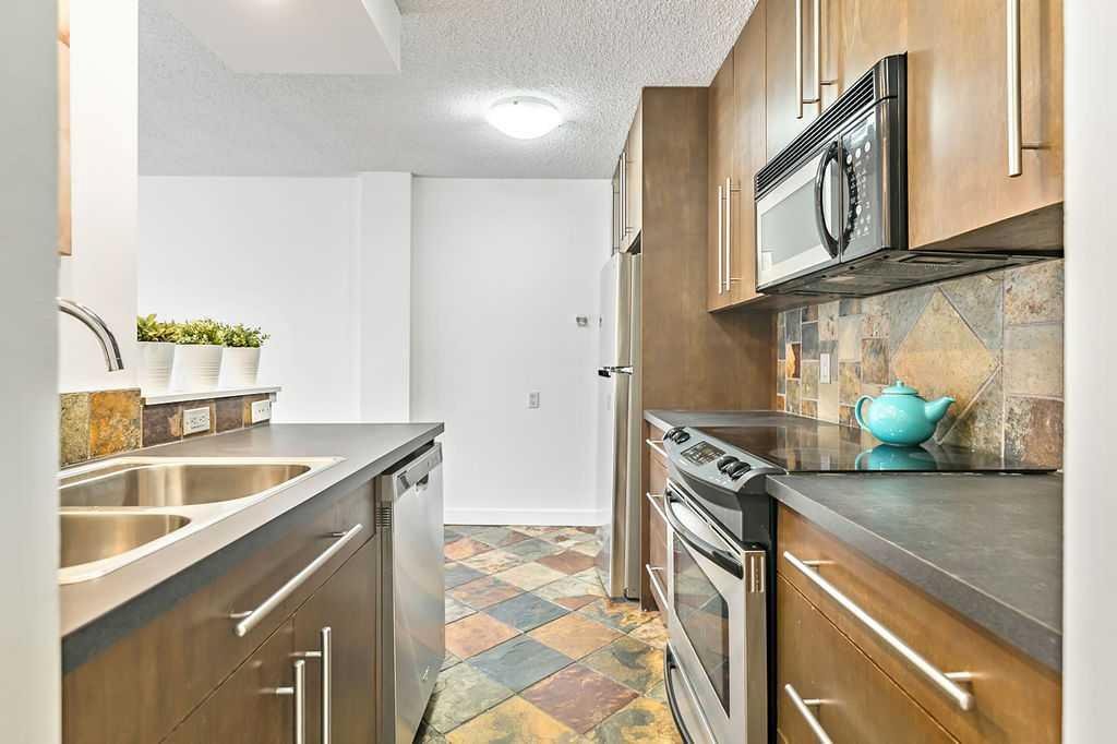 Bright and stylish top-floor condo in a quiet, concrete building in the desirable community of Bankview. This well-maintained suite features a functional open-concept layout, updated flooring, a custom kitchen, and convenient in-suite European washer/dryer. Spacious bedroom includes a custom wardrobe, while the bathroom offers a relaxing soaker tub and large vanity. Enjoy west-facing views from your private balcony. Additional features include assigned parking and a main-level storage locker. Solid concrete construction provides excellent sound insulation, no post-tension cables, storage, and private setting offer comfortable and quiet living. Ideally located within walking distance to 17th Avenue’s shops, cafés, and amenities, with easy access to transit and downtown. Pet friendly with board approval (2 cats or 1 cat and 1 dog permitted). A fantastic opportunity for low-maintenance inner-city living!