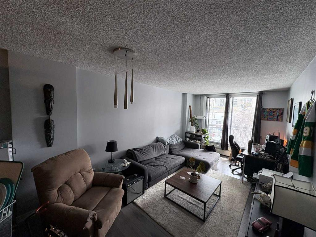 investors, or those seeking the best of downtown living. Natural light floods the living space throughout the day, creating a warm and inviting atmosphere year-round. This building is situated, close to shopping and the Bow river to enjoy on hot summer day, just steps from Prince’s Island Park, The comfortable sized bedroom and living room. The open-concept layout flows effortlessly through the kitchen, dining, and living areas — perfect for comfortable living or entertaining. Enjoy a tour through this well lit apartment featuring Quartz counter tops, good kitchen cabinets space and laminate wood floors. Fresh paint and new windows just few years ago.