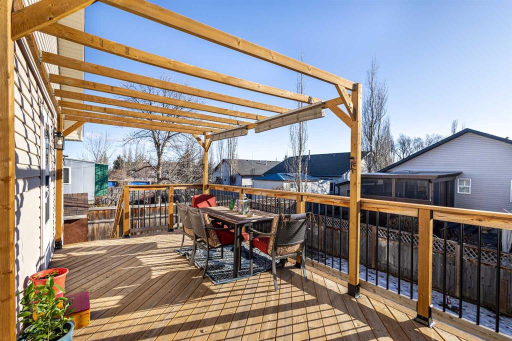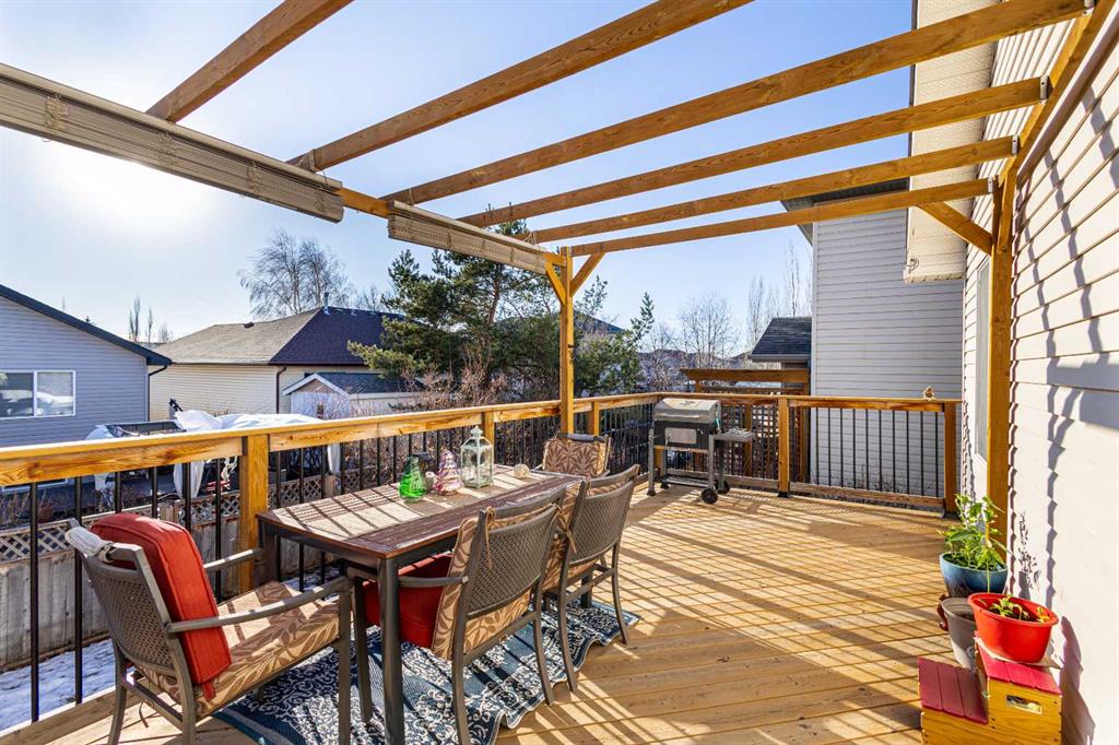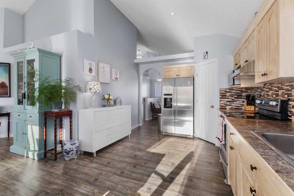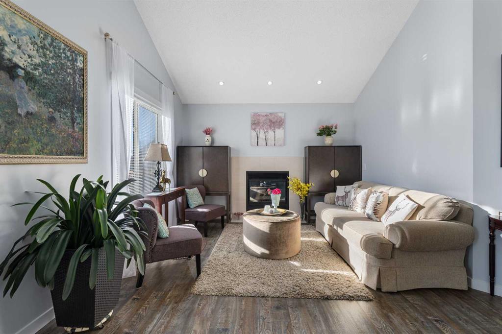 This beautifully maintained bi-level home is located on a quiet cul-de-sac in the desirable Highwood Village community and offers over 2,700 sqft of developed living space. Bright and spacious throughout, the home features soaring fourteen-foot vaulted ceilings and a skylight that fills the main level with natural light. The functional layout offers open yet well-defined living spaces, highlighted by a cozy gas fireplace that adds warmth and charm. The primary bedroom is privately situated on its own level, creating a comfortable retreat separate from the main living areas. The fully finished lower level provides bright, flexible space ideal for a family room, home office, gym, or guest area. Central air conditioning was installed in 2024 for added year-round comfort. The double attached garage is a standout feature, complete with upgraded 220V wiring and a hot and cold water sink. An extended parking pad provides extra parking and is perfect for additional vehicles, trailers, or workspace needs. The generous spacing between neighboring homes creates an added sense of privacy and also offers potential for future RV parking. Step outside to the fully fenced backyard featuring a spacious deck, storage shed, and additional 220V electrical service. Located within walking distance to schools, parks, a spray park, shopping, and Highwood Lake, with plenty of nearby recreation options, this move-in ready home offers outstanding value in High River.