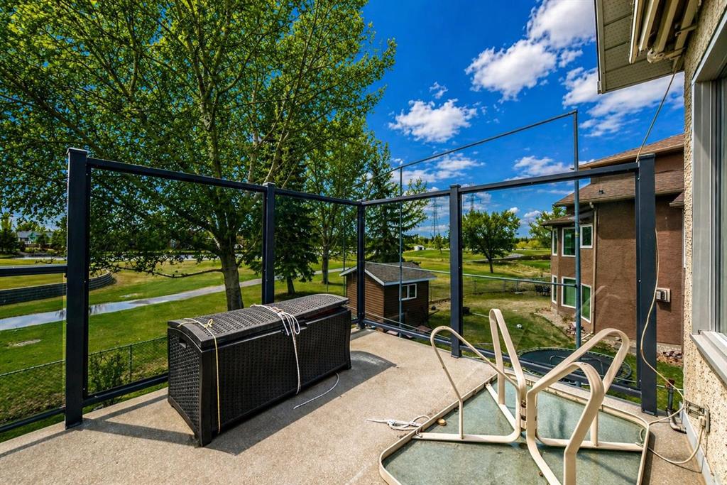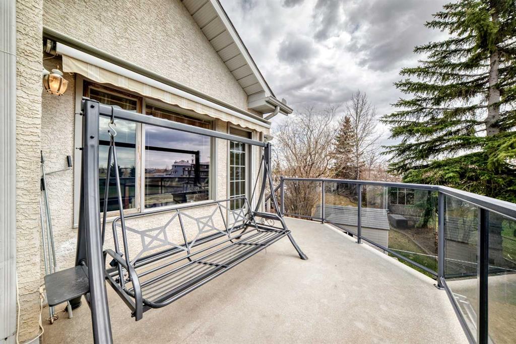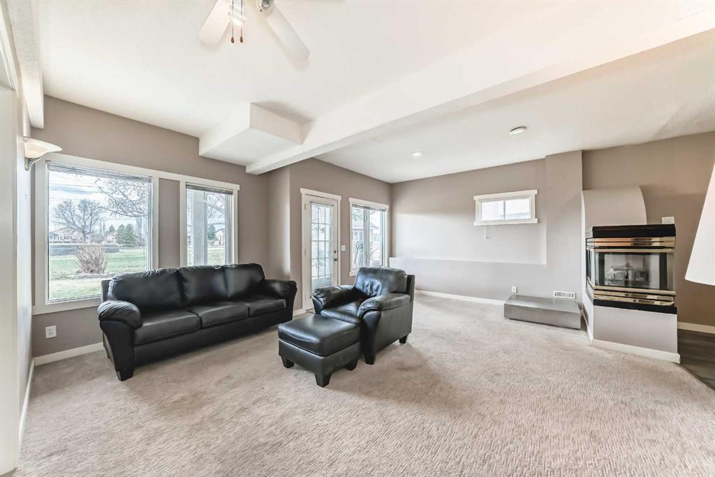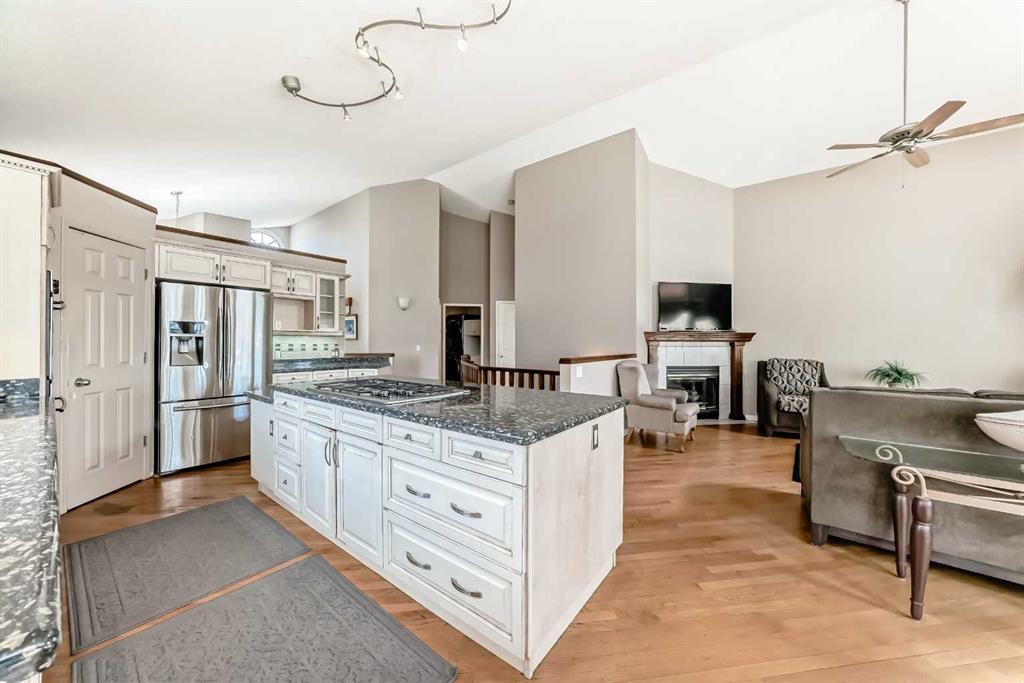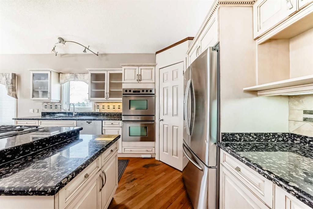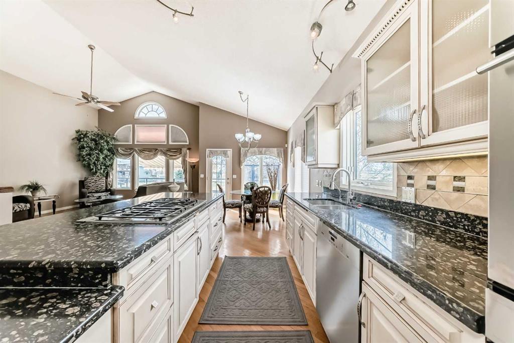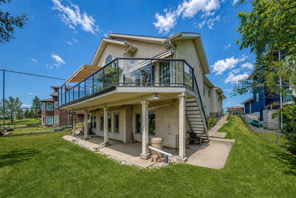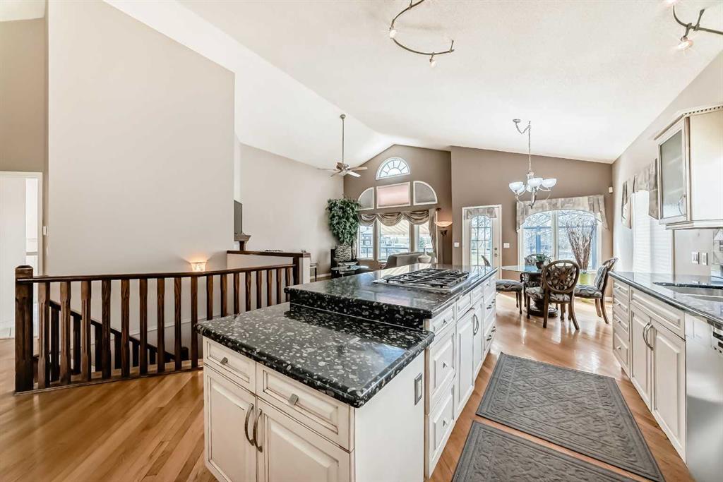 The generous primary bedroom also enjoys direct balcony access and is complemented by a large 4- piece ensuite with heated ceramic tile floors, a jetted soaker tub, and a separate shower. A formal dining room, den/study, 2-piece bath, and a laundry/mudroom complete the main level, with convenient access to the fully finished, oversized garage. Downstairs, the bright walk-out level features large windows and impressive views of its own. You’ll find a spacious family room with a three-sided fireplace, plus a den/bedroom, and access to a large patio. An unbelievably large kitchen/dining area offers plenty of cupboards, quartz countertops, stainless steel appliances, and a large pantry. This level also includes a 4-piece bath, a mechanical room with a second laundry area, and a third bedroom with a 3-piece ensuite. on an oversized lot in a quiet cul-de-sac, this home offers an outstanding location and incredible potential. With your ideas and a little polishing, this property could be the crown jewel of the cul-de-sac.