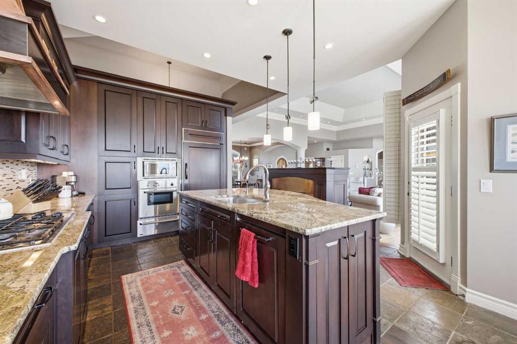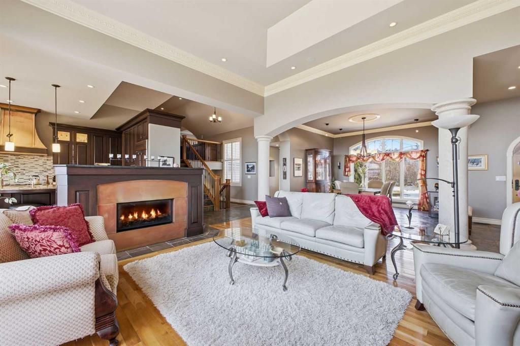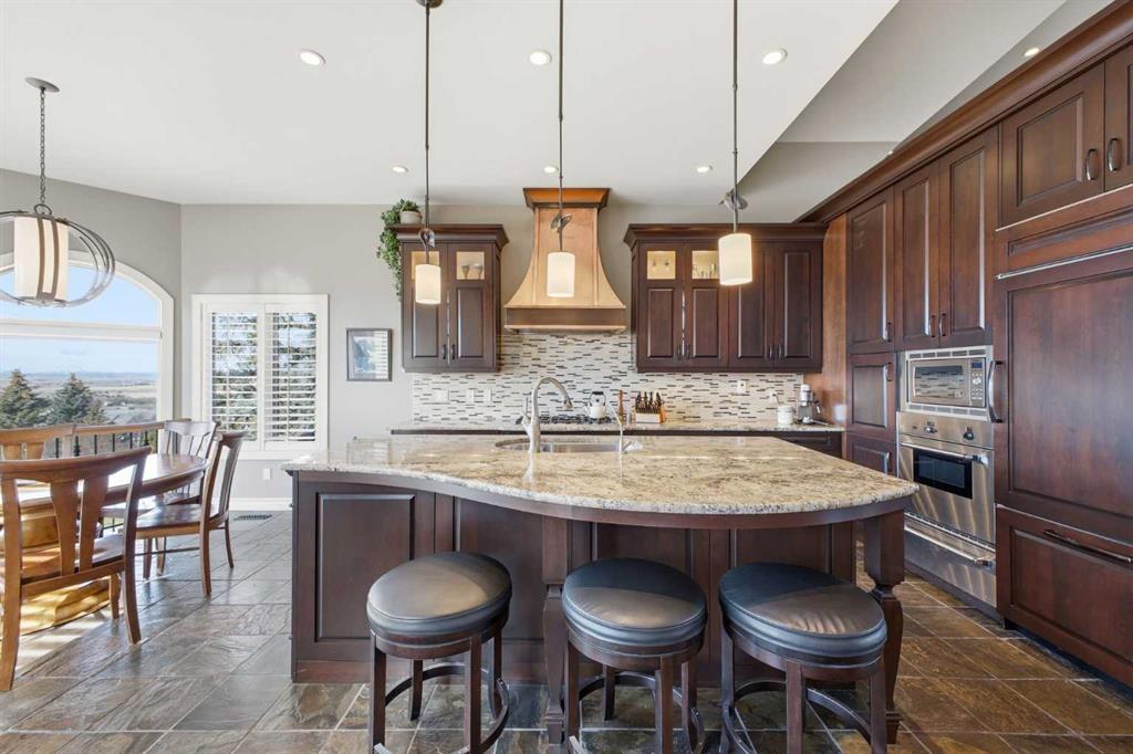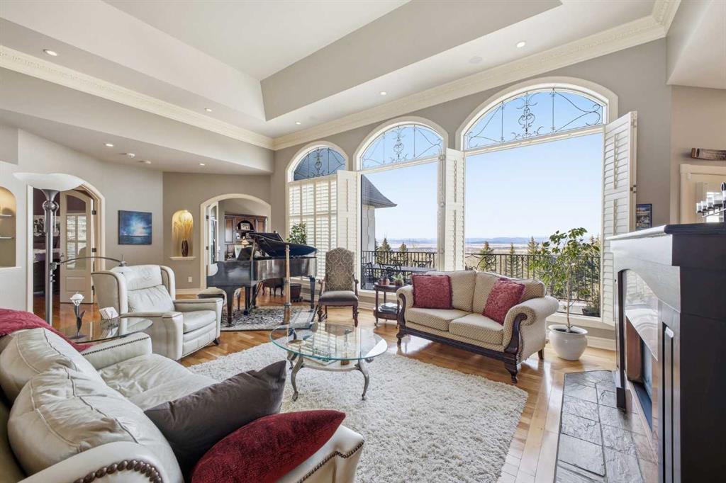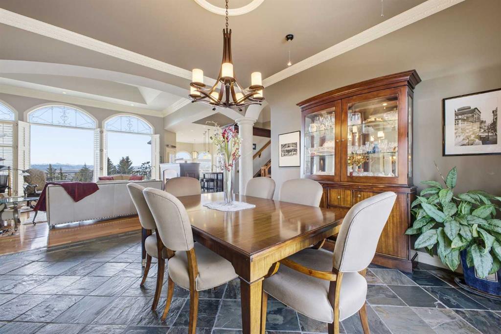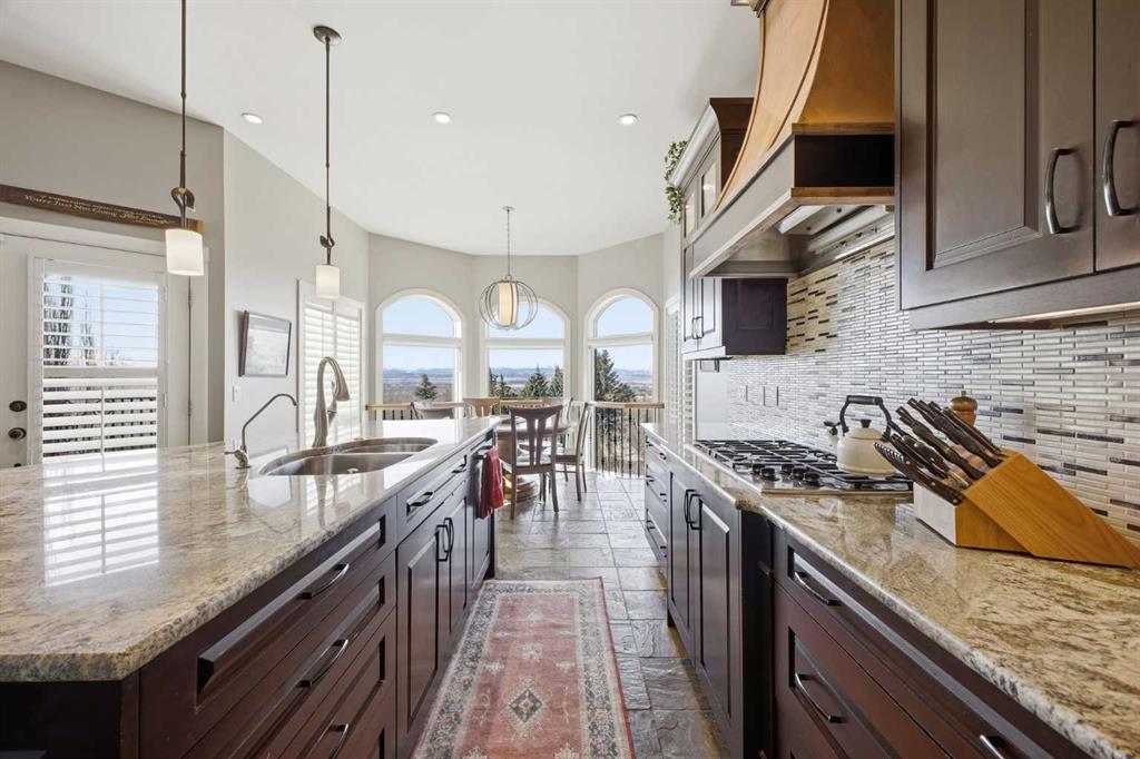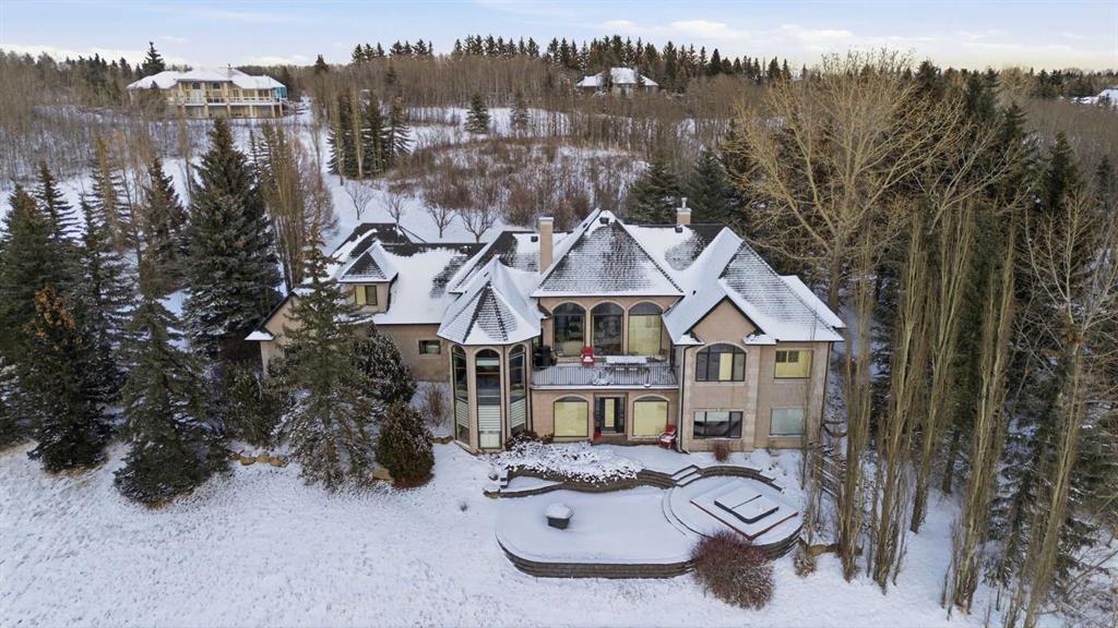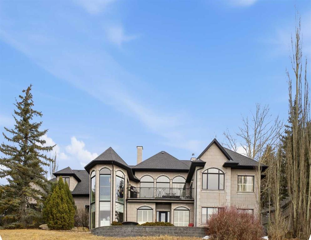 An expansive 2 acre estate in prestigious Pinnacle Ridge, perfectly positioned to capture sweeping, unobstructed views of the Rocky Mountains. This elegant 4 bedroom residence offers nearly 5,200 sq ft of refined living space, including a fully developed walk out basement. The main level showcases hardwood and slate flooring, 9’ ceilings, crown moulding, and an abundance of windows that drench the home in natural light. A formal dining room provides generous space for hosting, while the living room features a tray ceiling and a double sided fireplace for added warmth and ambiance. The tastefully updated chef’s kitchen is appointed with granite countertops, a large island with eating bar, extensive cabinetry, top tier appliances, and a bright breakfast nook framed by serene mountain views. Also on the main level, the private primary retreat includes a walk in closet and a luxurious 5 piece ensuite with dual sinks, a freestanding soaker tub, and a glass enclosed shower. A dedicated office/den is tucked just off the living room—ideal for a quiet workspace—and a 2 piece powder room completes the level. The upper floor offers a spacious bonus room, perfect for a media lounge, studio, or additional office. The fully developed walk out basement extends the living space with a large recreation room, wet bar, and an insulated wine cellar for the enthusiast. This level also includes a flex room with Murphy bed (currently used as a home gym), two additional bedrooms, den, two full bathrooms, and a well appointed laundry room with sink, storage, and hanging racks. Additional features include central air conditioning, a new boiler system, built in speakers throughout, and leaf filters on all eavestroughs with a lifetime warranty. Outdoor living is exceptional with a large upper deck and tiered patio overlooking impeccably landscaped grounds and breathtaking mountain vistas—an ideal setting for relaxation or entertaining. The heated triple attached garage is equipped with a Level 2 EV charger. Located just off Springbank Road, this property offers quick access to the city and an easy drive to the mountains.