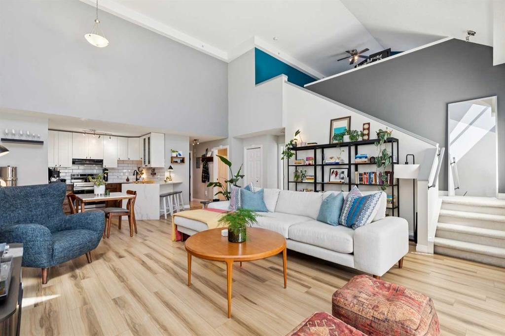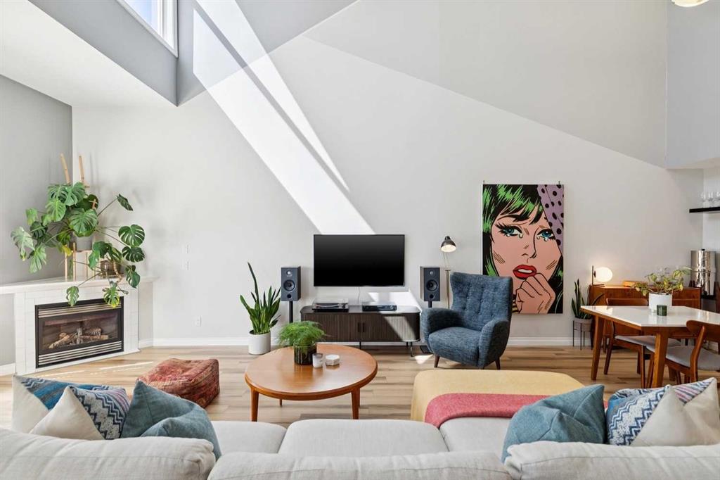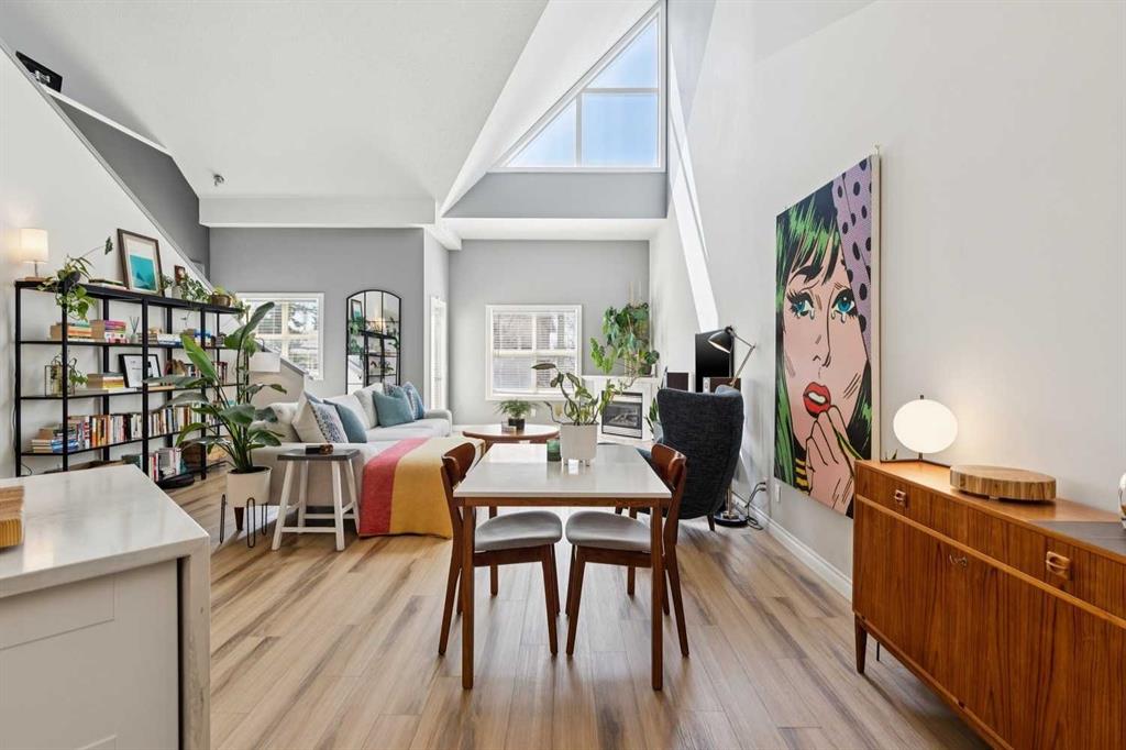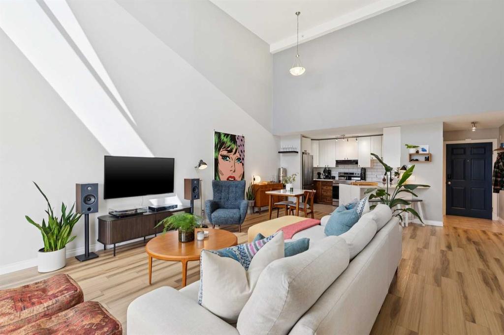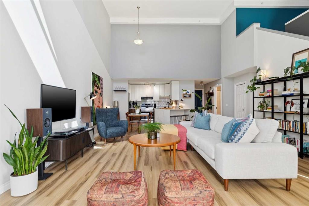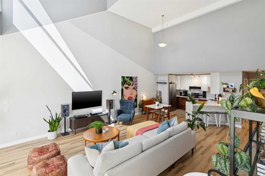 Welcome to this gorgeous 1,241 sqft TOP FLOOR 2-storey condo in the heart of vibrant Marda Loop, offering 1 spacious bedroom with a walk-through closet, 2 full bathrooms (one is an ensuite), a versatile loft that could be used as a second bedroom, in-floor heat, and a long private balcony! Soaring 2-storey ceilings – peaking at an impressive 25 feet – and expansive windows flood the space with natural light, creating an open, airy feel throughout. Step inside to discover thoughtful updates throughout, including a fully updated kitchen, bathrooms, paint, flooring, and lighting. The sleek kitchen features stainless steel appliances, updating cabinetry, a breakfast bar, quartz counters, in-floor heat, and opens to a huge living room with a beautiful gas fireplace and a dining area, perfect for entertaining. Luxury vinyl plank flooring adds warmth and durability to the space. The private primary suite is tucked away with direct access to the balcony, a walk-through closet, and a large ensuite bathroom with a corner soaker tub, separate stand-up shower, and updated vanity, sink, faucet, and light fixture. A second full bathroom near the front entry (rare for a one-bedroom home) offers a tub/shower combo and quartz counters for added flexibility, and in-unit laundry is also included. Upstairs, the bright and spacious loft provides endless possibilities for a bedroom, home office, gym, reading nook, or play area. Enjoy summer evenings on your south-facing private balcony with a gas BBQ hook-up, and take advantage of the titled underground parking stall, secure storage locker, and convenient bike storage. Located just steps from boutique shops, trendy cafĂ©s, and some of Calgary’s best restaurants, plus minutes from 17th Avenue, downtown, and fantastic recreational amenities like an outdoor pool, tennis courts, skating rink, ball diamond, and public library – just a few short blocks away! This move-in-ready home is a rare find – book your showing today!