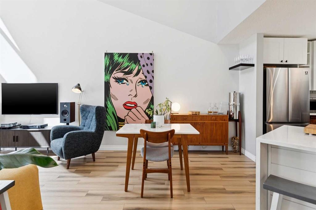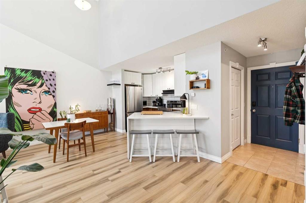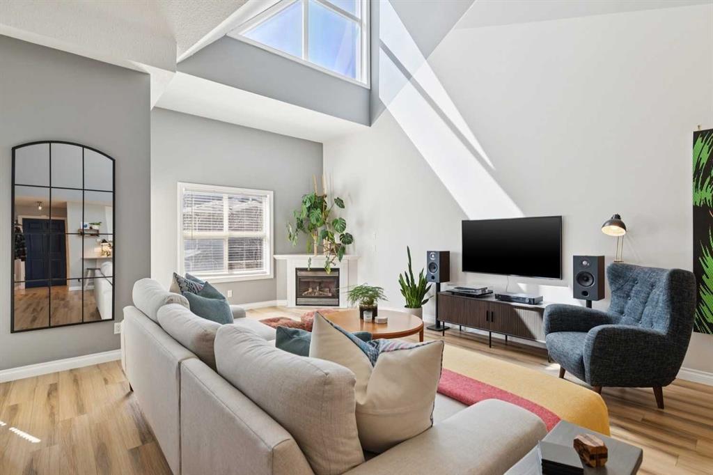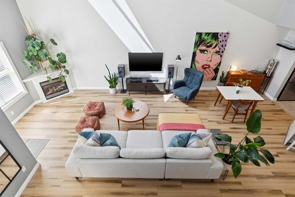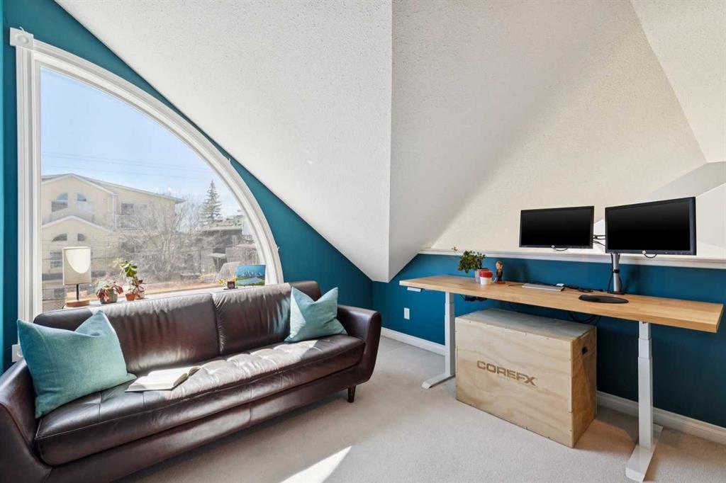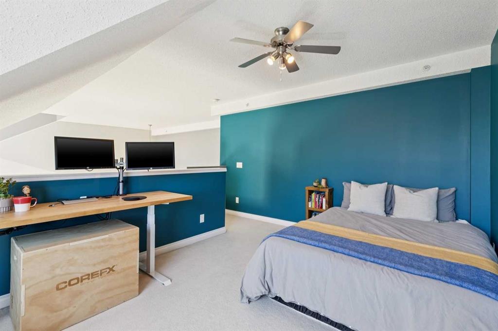 Welcome to this gorgeous 1,241 sqft TOP FLOOR 2-storey condo in the heart of vibrant Marda Loop, offering 1 spacious bedroom with a walk-through closet, 2 full bathrooms (one is an ensuite), a versatile loft that could be used as a second bedroom, in-floor heat, and a long private balcony! Soaring 2-storey ceilings – peaking at an impressive 25 feet – and expansive windows flood the space with natural light, creating an open, airy feel throughout. Step inside to discover thoughtful updates throughout, including a fully updated kitchen, bathrooms, paint, flooring, and lighting. The sleek kitchen features stainless steel appliances, updating cabinetry, a breakfast bar, quartz counters, in-floor heat, and opens to a huge living room with a beautiful gas fireplace and a dining area, perfect for entertaining. Luxury vinyl plank flooring adds warmth and durability to the space. The private primary suite is tucked away with direct access to the balcony, a walk-through closet, and a large ensuite bathroom with a corner soaker tub, separate stand-up shower, and updated vanity, sink, faucet, and light fixture. A second full bathroom near the front entry (rare for a one-bedroom home) offers a tub/shower combo and quartz counters for added flexibility, and in-unit laundry is also included. Upstairs, the bright and spacious loft provides endless possibilities for a bedroom, home office, gym, reading nook, or play area. Enjoy summer evenings on your south-facing private balcony with a gas BBQ hook-up, and take advantage of the titled underground parking stall, secure storage locker, and convenient bike storage. Located just steps from boutique shops, trendy cafĂ©s, and some of Calgary’s best restaurants, plus minutes from 17th Avenue, downtown, and fantastic recreational amenities like an outdoor pool, tennis courts, skating rink, ball diamond, and public library – just a few short blocks away! This move-in-ready home is a rare find – book your showing today!