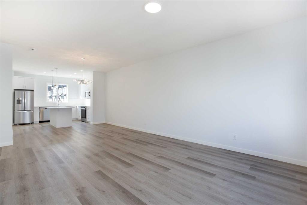 The main floor features contemporary luxury vinyl plank flooring that flows through the kitchen, dining, living areas, bathrooms, and laundry. The open-concept kitchen is thoughtfully designed with slab-profile cabinets and drawers, crisp white quartz countertops, and an eating bar that’s perfect for casual meals or entertaining. A designated dining area offers space for hosting, while the adjacent upper balcony off the main living room provides a peaceful spot to enjoy morning coffee or evening sunsets.