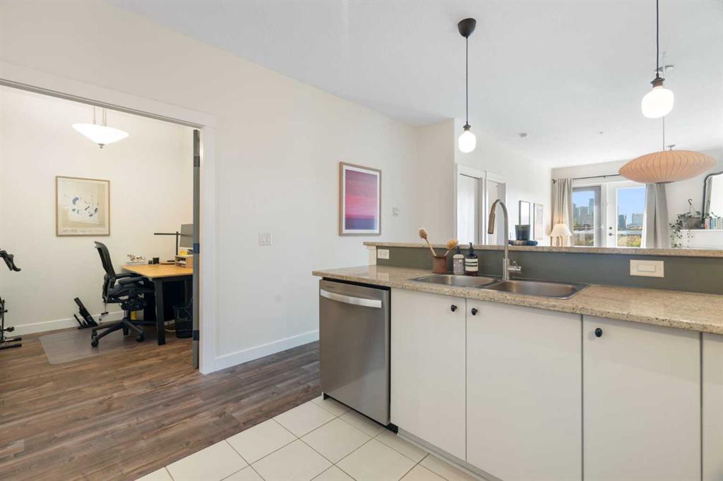 Top-floor end unit with unobstructed downtown views in the heart of Bridgeland. This quiet and secure 2 bedroom, 2 bathroom plus den condo offers the perfect blend of style, function, and location. With no one living above you, enjoy added privacy and natural light throughout the bright, open floor plan. Hardwood floors run through the main living spaces, while the kitchen features granite countertops, ample cabinetry, a breakfast bar, pantry, and stainless steel appliances including a new dishwasher. The den with French doors provides an ideal home office or flexible bonus space. The open concept living and dining room includes a cozy corner gas fireplace and a west-facing balcony with stunning city views. The two spacious bedrooms are located on opposite sides of the unit, ideal for privacy. The generous primary suite features a walk-through closet and 4-piece ensuite, while the second bedroom sits conveniently beside the main 4-piece bath. Additional features include in-suite laundry with full-size washer and dryer, assigned parking and storage locker in the secure heated parkade, and pet-friendly bylaws with board approval. Located steps to Bridgeland’s best restaurants, cafes, shops, the C-Train, river pathways, and more, this home offers the ultimate inner-city lifestyle.