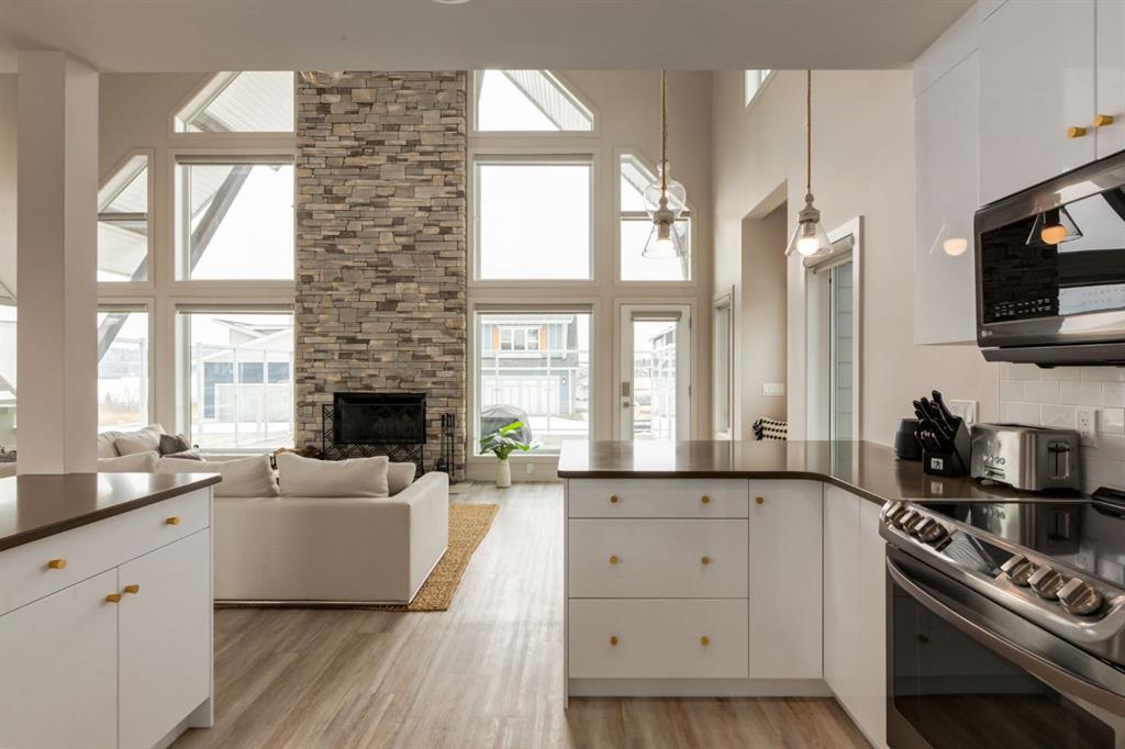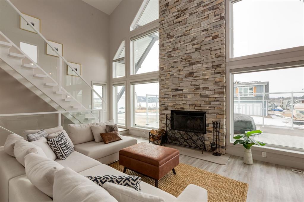 Modern architecture meets effortless lake living in this beautifully designed open-concept home. Soaring vaulted ceilings and a spacious great room with a cozy wood-burning fireplace create an inviting atmosphere, while durable laminate flooring flows throughout.