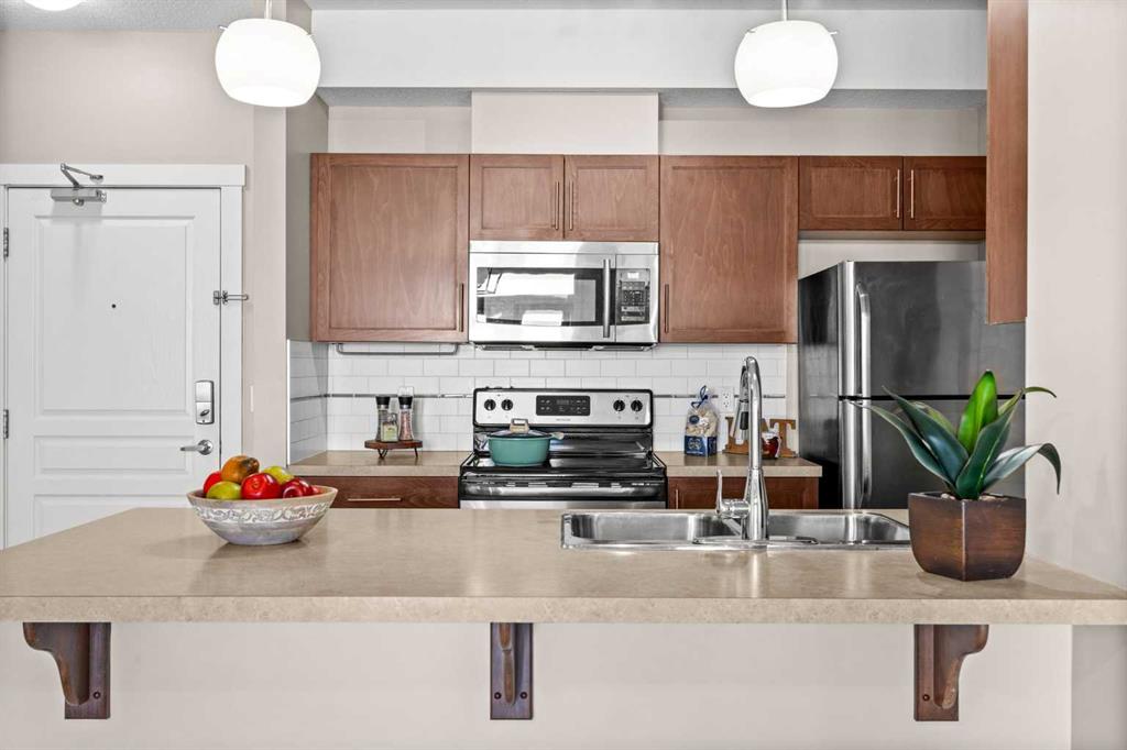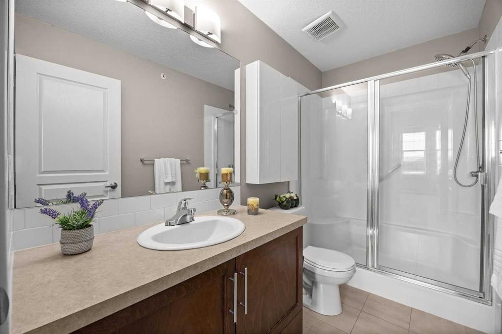 Welcome to this beautifully updated 2-bedroom, 2-bathroom apartment in the desirable community of Evanston. Situated on the TOP FLOOR, this unit offers a bright, functional layout with enhanced privacy and thoughtful upgrades throughout. The home features BRAND-NEW vinyl plank flooring in the main living areas and BRAND-NEW carpet in both bedrooms. The open-concept kitchen is equipped with stainless steel appliances and flows seamlessly into the living and dining spaces—perfect for both everyday living and entertaining. The primary bedroom includes a walk-in closet and a private ensuite bathroom. The second bedroom is generously sized and ideal for guests, family, or a home office. A built-in desk adds excellent functionality for working or studying from home. Step out onto your private top-floor balcony to enjoy morning coffee or unwind in the evening with open views and added privacy. Additional highlights include: UNDERGROUND TITLED PARKING stall, in-suite laundry, with the laundry room doubling as a spacious storage area and an assigned external storage unit, providing even more storage space. The location is unbeatable—just minutes from Creekside and Sage Hill Crossing shopping centres, offering major retailers such as Walmart, T&T Supermarket, banks, and a wide variety of amenities. With easy access to Stoney Trail and Shaganappi Trail, commuting across the city is quick and convenient. This well-maintained condo offers the perfect balance of comfort, convenience, and value, making it an excellent opportunity for homeowners and investors alike. Come, visit, and make this your new place to call home.