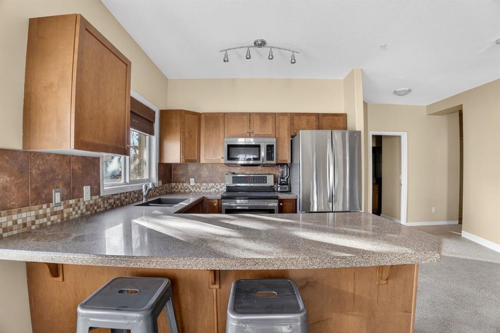 Welcome to this ground-floor corner unit in the heart of Okotoks, offering the perfect blend of comfort, convenience, and lifestyle. With 921 sq ft of thoughtfully designed living space, 9’ ceilings, and an abundance of natural light, this 2-bedroom condo feels open, bright, and inviting from the moment you step inside. The functional layout seamlessly connects the kitchen, dining, and living areas, creating an ideal space for both everyday living and entertaining. The kitchen features stainless steel appliances, ample cabinetry, and generous counter space, making meal prep effortless. Large windows enhance the airy feel while the corner-unit location provides added privacy and extra light. The spacious primary bedroom offers plenty of room to unwind, while the second bedroom is perfect for guests, a home office, or additional family space. Enjoy the convenience of in-suite laundry and ample storage throughout. One of the standout features of this home is the rare offering of TWO titled parking stalls — a valuable bonus for couples or guests. Step outside and embrace the lifestyle that makes this community so desirable. With lake access included, you can enjoy year-round recreation right at your doorstep. The building’s amenities further elevate your living experience, featuring a fully equipped gym, steam room, hot tub, and an entertainment/lounge area perfect for hosting or relaxing.