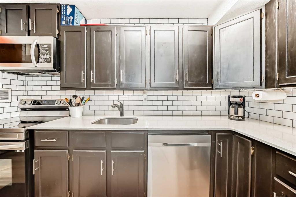 Welcome to Unit 4105 of Southampton Greens — a thoughtfully renovated 1-bedroom, 1-bath MAIN FLOOR condo unit in a quiet location within the complex. Updated in 2023 with quartz countertops, subway tile backsplash, new appliances, under-cabinet lighting, and plumbing fixtures. The unit features a bright and functional layout with vinyl plank flooring throughout for a clean and cohesive look. Storage is never an issue with in-suite storage room plus two additional outdoor storage rooms on the 15 ft. x 6 ft. south-facing patio. Enjoy the expansive green space across the patio ideal for relaxing, gardening, or soaking up the sun. The complex offers excellent amenities including playground, party room, basketball court, tennis court, table tennis, fitness room, and visitor parking. This unit comes with one assigned, plug-in, parking stall. Centrally located with easy access to major routes and everyday essentials — minutes to Anderson LRT, Southcentre/Chinook Mall, numerous schools and parks. This unit offers convenience, comfort and enjoyment.
