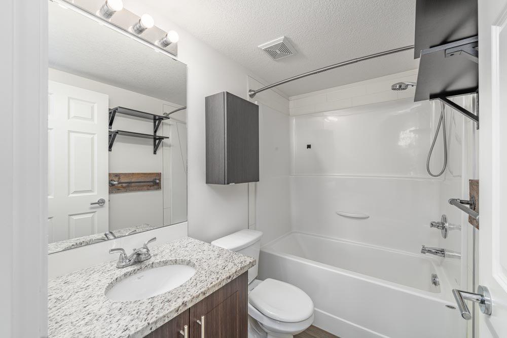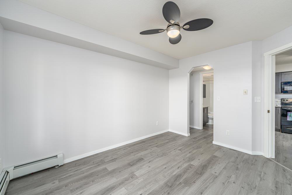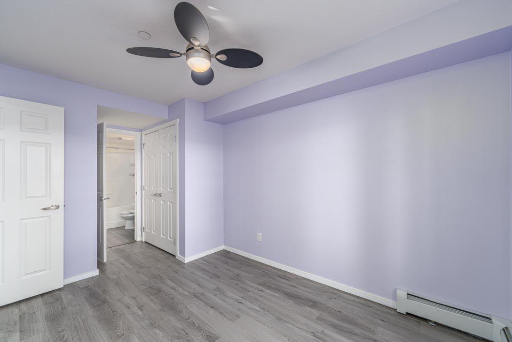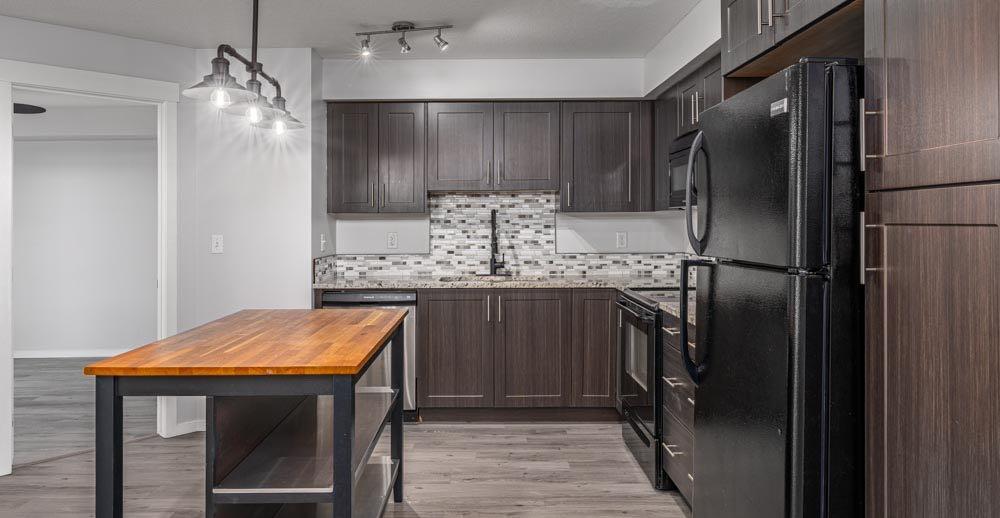 Inside, brand-new luxury vinyl plank flooring ties together a bright open-concept plan. The modern kitchen offers quartz countertops, full-height cabinetry, and a central island that opens to the living area so the natural outlook stays front and center when you cook, host, or unwind. The primary bedroom includes a private 4-piece ensuite and walk-in closet; the second bedroom has convenient access to the main 4-piece bathroom, which also functions as a guest bath from the hallway – a flexible setup for family, visitors, or a home office.
