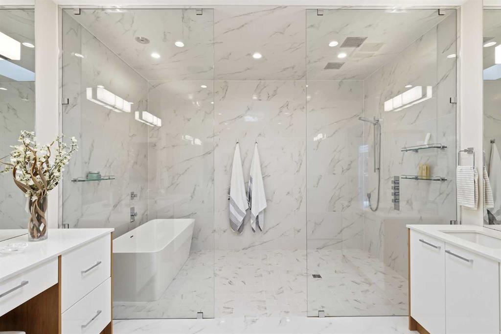 Upstairs, the expansive primary suite is a true retreat, featuring a stunning dressing room and a spa-like ensuite with heated floors, dual sinks, a freestanding tub, and a luxurious walk-in shower. Three additional bedrooms with generous walk-in closets, a laundry room, loft area, and bonus room complete the upper level. The lower level is designed for both relaxation and entertainment, offering in-floor heating, a theatre room, guest quarters, a steam shower, recreation area, and wine room.