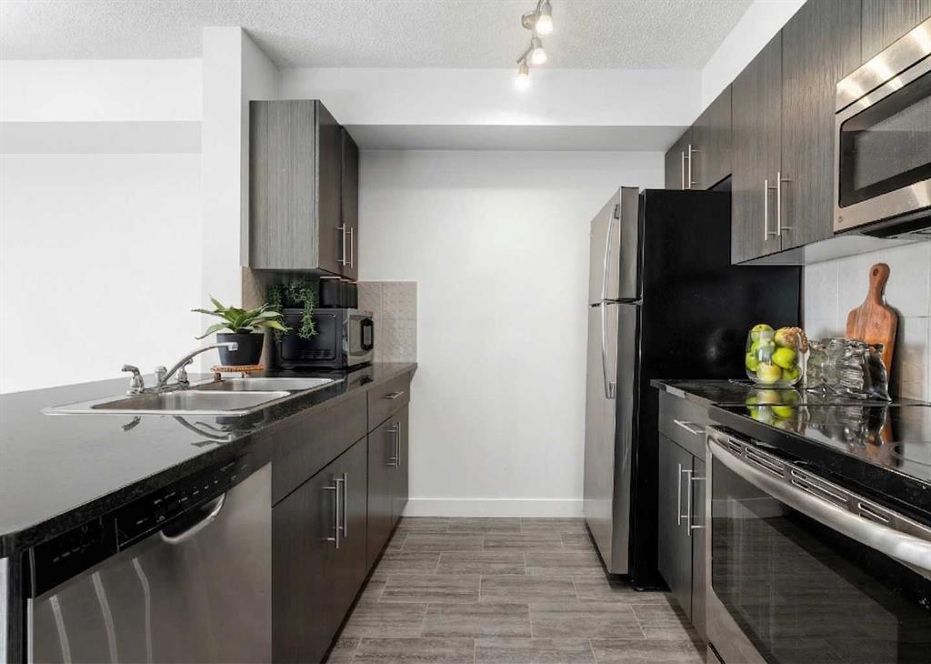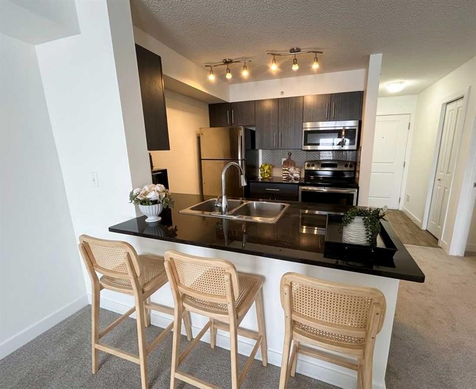 IMMACULATE TOP-FLOOR LIVING WITH NEW UPGRADES! Discover incredible value in this freshly updated 2-bedroom condo, featuring BRAND-NEW CARPET and FRESH PAINT throughout. Perfectly positioned for investors seeking a turnkey rental or buyers wanting a pristine, move-in-ready home, this unit offers the rare “new home” feel with the benefit of LOW CONDO FEES. Featuring brand-new, never-used carpet, nearly 700 sq.ft. of open-concept space with a peaceful PARK/POND VIEW from your south facing patio, a setting you’ll appreciate every day. The open-concept kitchen shines with stunning stone countertops and dark rich cabinetry. The additional large counter with space for stools, makes it the perfect spot for everyday use, casual meals or hosting family and friends. The kitchen flows into the bright main living area providing a peaceful place to relax after a long day. The dining area is the perfect place to gather with family and friends for meals and special occasions. Enjoy the convenience of in-suite laundry, and a layout that maximizes every square foot.The primary bedroom offers plenty of room to unwind and includes a large closet, while the second bedroom is also nicely sized and features its own closet. A 4-piece bathroom completes the layout with stylish stone counters. Step outside to your balcony, ideal for BBQs, fresh air, and quiet moments outdoors. Other notable features include IMMEDIATE POSSESSION AVAILABILITY, low condo fees, and a conveniently located parking stall close to the main entrance. The elevator is also conveniently located close to your unit for easy access in and out. Located steps from the Saddletown C-Train, Genesis Centre, and local dining, this home offers an unbeatable lifestyle or investment opportunity. Note: Some Photo’s are virtually staged in listing. This Condo offers excellent value for first-time buyers, professionals, downsizers, or anyone looking for a reliable investment opportunity. Schedule your showing today and come see everything this property has waiting for you!