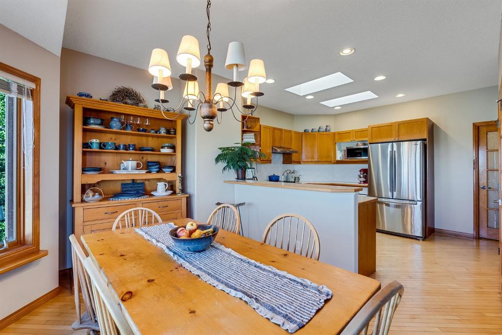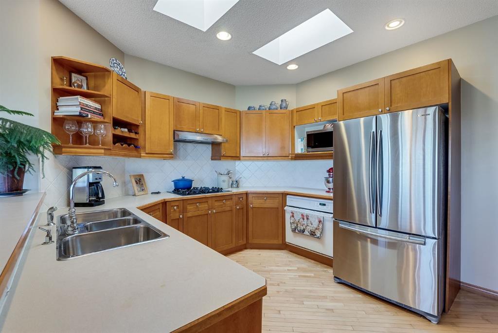Inside, you’ll find custom maple woodwork throughout, soaring vaulted ceilings, and cozy touches like a built-in window bench and a fireplace framed by rich cabinetry. The kitchen is warm and functional with a gas cooktop, skylights, and open views to the bright dining area and backyard beyond.