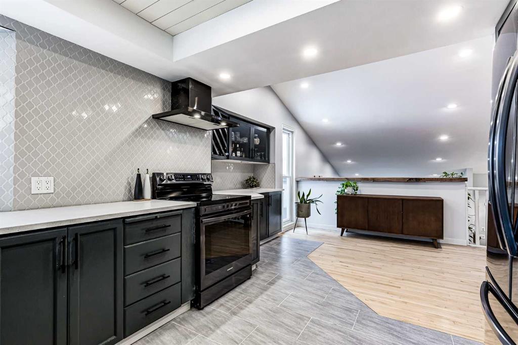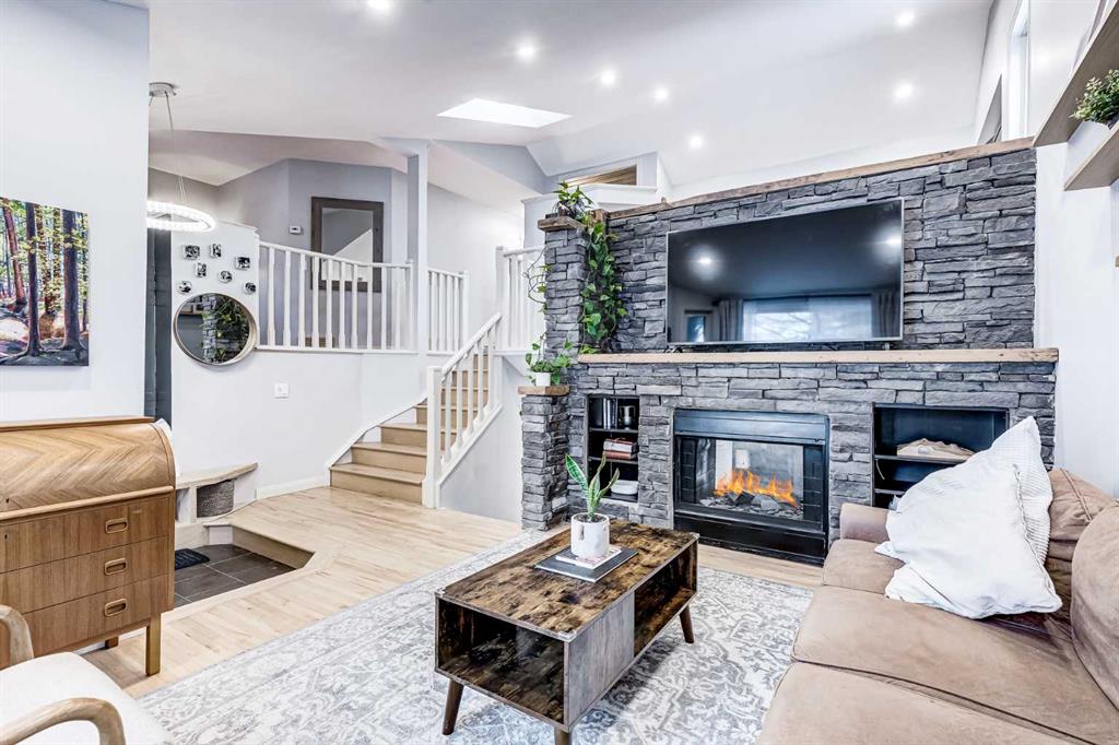 This home has been thoughtfully updated, featuring four bedrooms and two-and-a-half modern bathrooms. Highlights of the renovation include sleek new countertops throughout and luxurious, plush new carpeting. The main floor is designed to impress, with vaulted ceilings and a skylight that bathes the entrance in natural light, leading to a bright living room centered around a cozy double-sided feature fireplace.