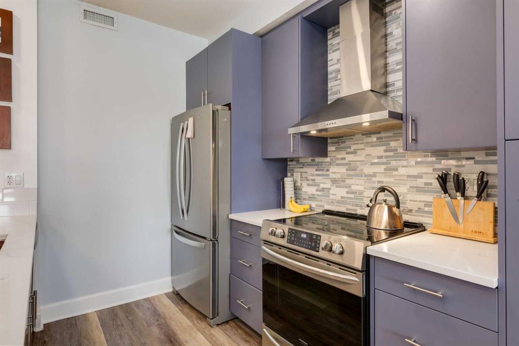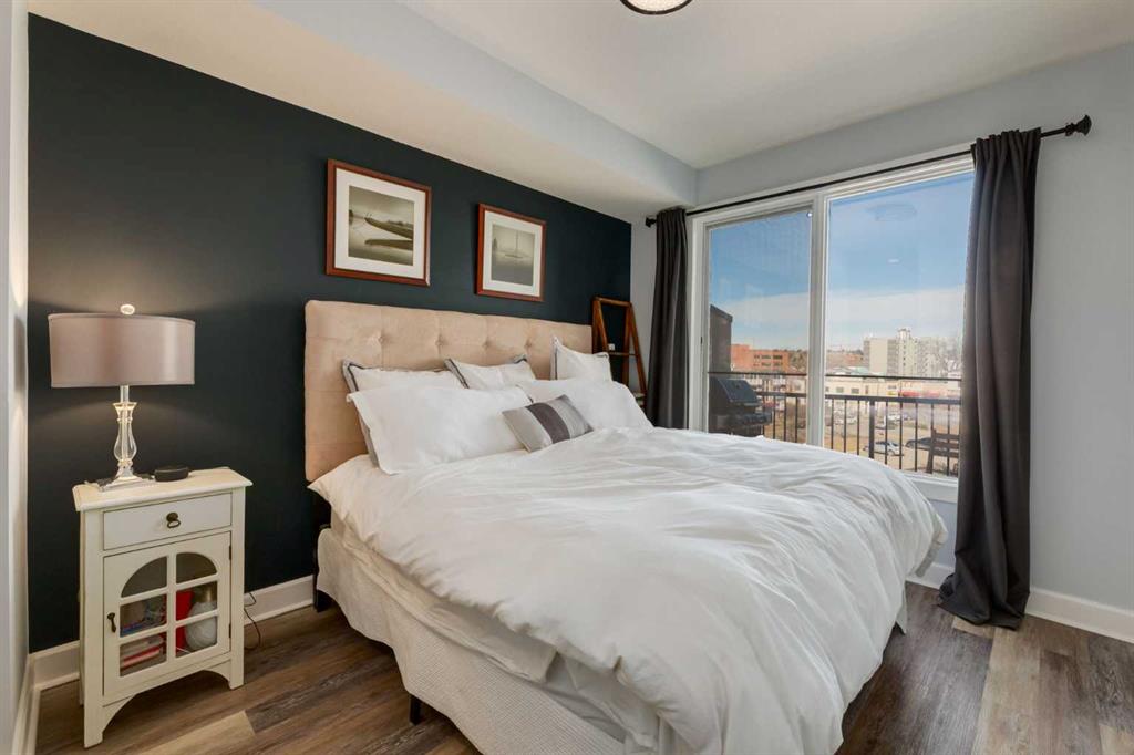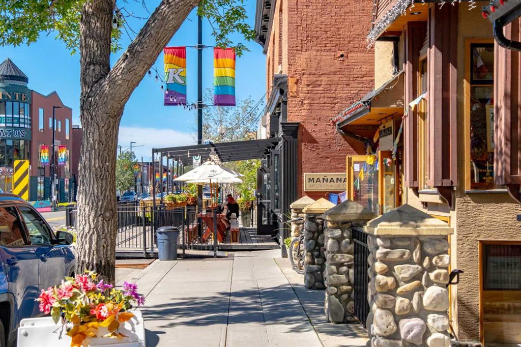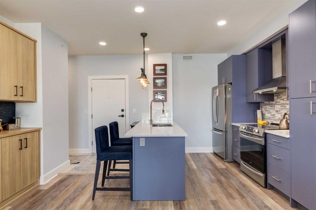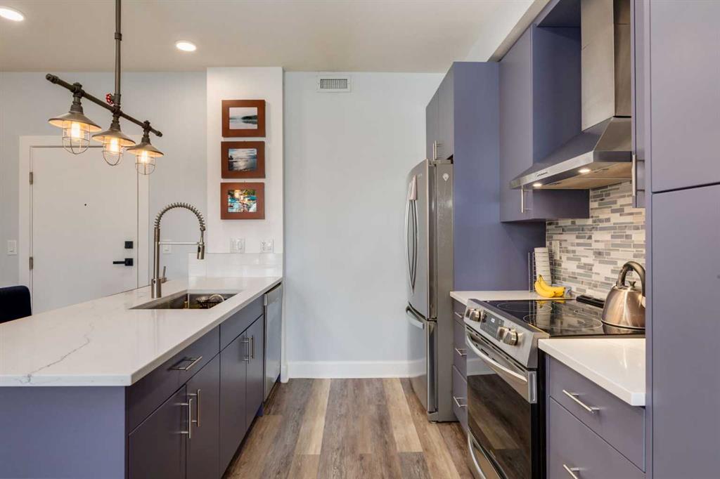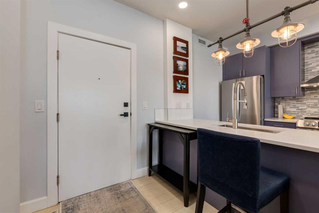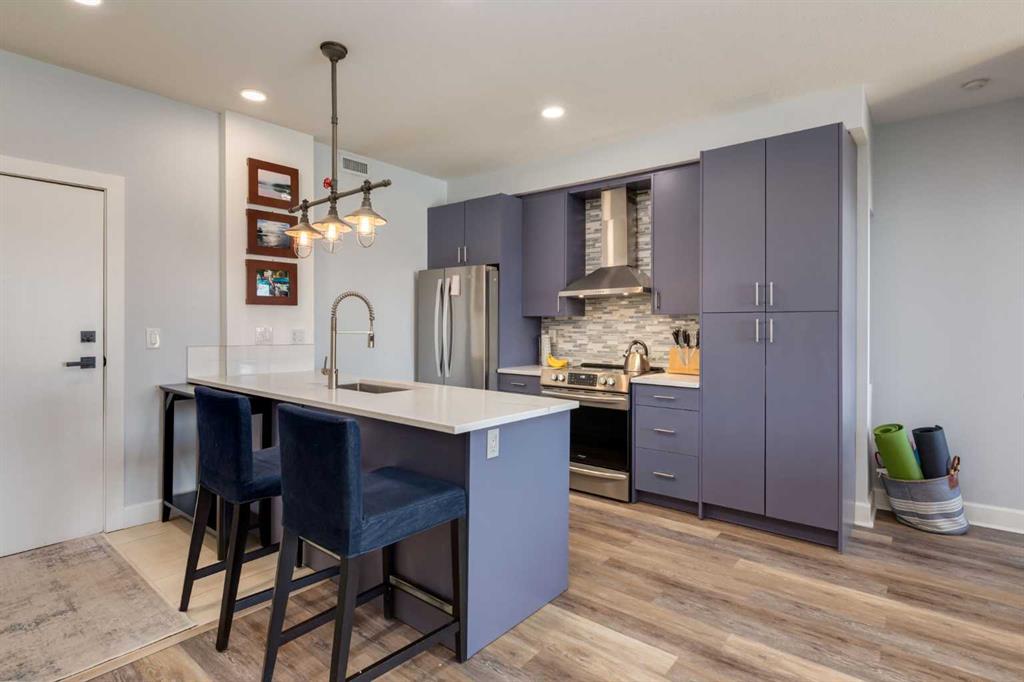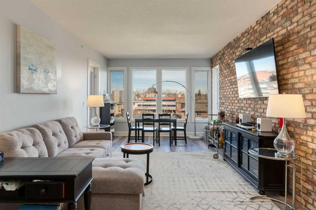 Welcome to Kensington living at its finest in The Providence Condo. This beautifully maintained building offers secure underground titled parking, storage, and a fully equipped fitness facility, all in one of Calgary’s most walkable and vibrant inner-city communities. Perched on the top floor, this fully renovated 2-bedroom, 2-bathroom residence showcases a bright contemporary design with refined industrial character. Thoughtfully curated finishes include Edison-style pendant lighting, a striking Chicago brick feature wall, wide plank luxury vinyl flooring, and a custom built-in wine display that adds both style and function. The open-concept kitchen makes a bold statement with rich navy cabinetry, stainless steel appliances, quartz countertops, and classic subway tile backsplash—perfectly designed for everyday living and entertaining alike. Both bedrooms and the private balcony capture impressive views toward Kensington and Southern Alberta Institute of Technology, while the spacious primary retreat features a walk-through closet leading to a beautifully updated ensuite complete with vessel sinks and elevated finishes. Just steps from trendy restaurants, cafés, groceries, transit, and the pathways along the Bow River, this home delivers the ultimate urban lifestyle in one of Calgary’s most sought-after neighbourhoods
