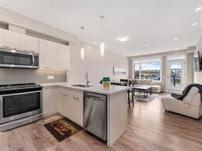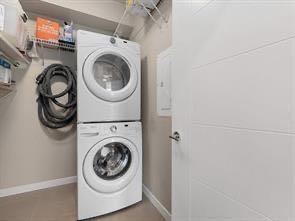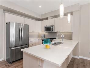 ***NEW PRICE***Welcome to this stunning 2-bedroom, 2-bathroom top floor condo offering style, comfort and convenience. Rarely available, this home includes three parking stalls-one underground and two outdoor. Step inside to an open and modern layout featuring a designer kitchen with quartz countertops, sleek cabinetry with LED tape lights, and stainless steel appliances. The soaring high ceilings with custom pot lighting create an elegant ambience while the luxury vinyl plank flooring adds a touch of sophistication. Enjoy the breathtaking views of Sherwood Square Lake from your private balcony (BBQ gas-line) -the perfect spot to relax and unwind. Both bedrooms are generously sized . with the primary suite offering a walkthrough closet and a full en-suite bathroom (standing shower) for added privacy. This beautiful condo combines modern finishes with everyday functionality, making it ideal for homeowners and investors alike. Great Location, Great Unit , Great Opportunity!