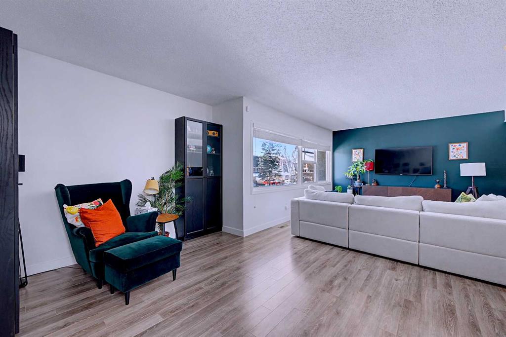 The interior is bright, open, and inviting, with large double pane windows that flood the space with natural light. The living room is designed to impress with its expansive layout, sleek laminate flooring, and modern accent wall, offering plenty of room for a full seating area, reading nook, or home office.