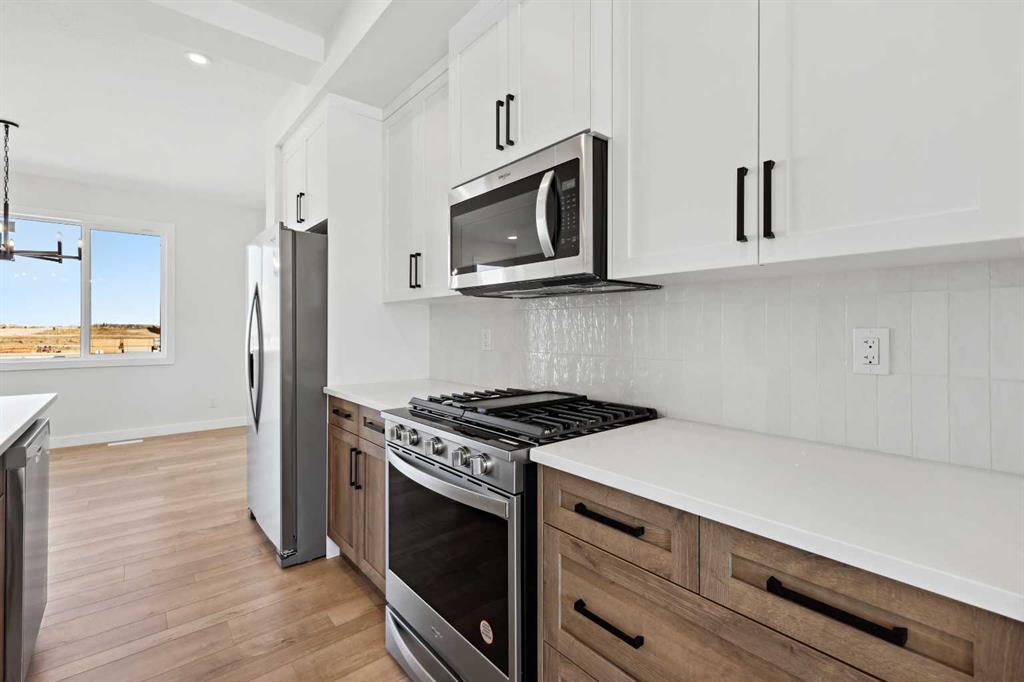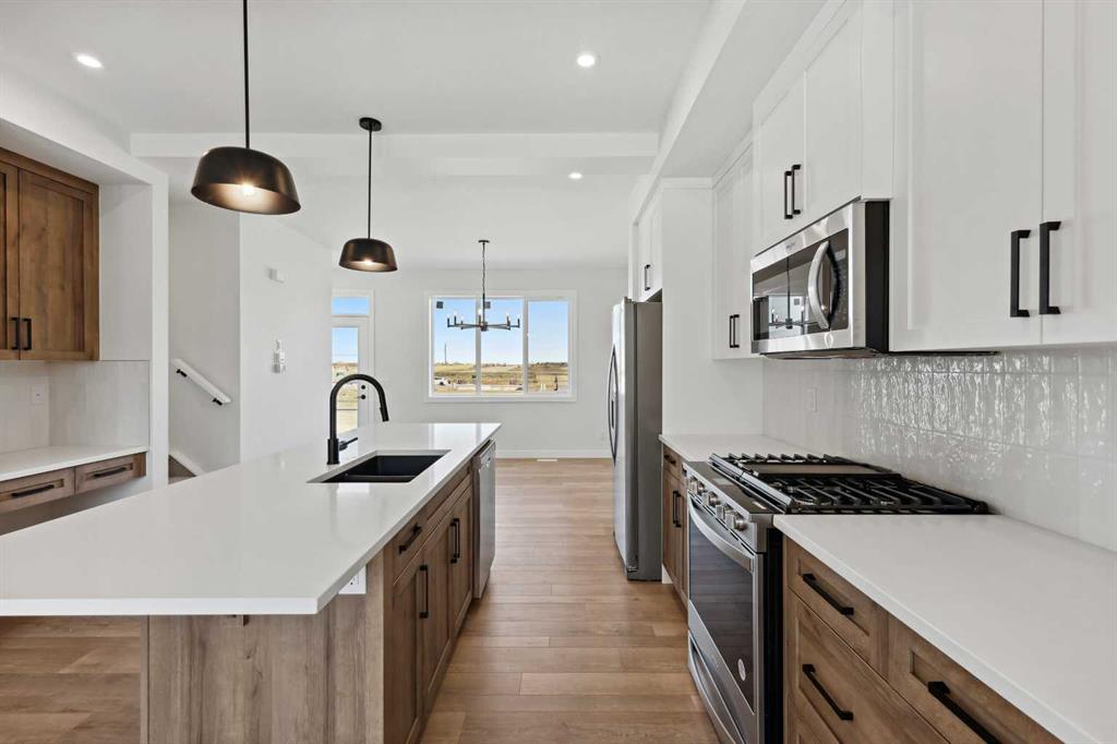 NEW PRICE! IMMEDIATE POSSESSION. BRAND NEW HOME by Douglas Homes, Master Builder in central Greystone, short walking distance to parks, the Bow River, major shopping & interconnected pathway system. Featuring the Fernie 2 with separate side entry on an R-MX zoned home site for POTENTIAL future lower level suite. NOTE: a secondary suite would be subject to approval and permitting by the city/municipality. This gorgeous 3 bedroom, 2 & 1/2 half bath home offers over 1360 sq ft of living space. This home is located on a River Avenue which provides immediate access to the interconnective pathway system, perfect for those looking for a outdoor lifestyle. Loads of Designer & upgraded features in this beautiful, open floor plan. The main floor greets you with 8′ front door, soaring 9′ ceilings, oversized windows, built-in niches & fireplace. Gleaming Hardwood floors flow through the kitchen, hall & nook adding a feeling of warmth & style. The two sided Kitchen is completed with Quartz Countertops, 42″ Kitchen Cabinet uppers with decorative enclosed bulkhead, plenty of drawers including Pots & Pan drawers, twin accented beam ceiling detail, soft close doors & drawers, convenient tech space/desk with twin drawers & new stainless steel Kitchen appliance package. Upstairs you’ll find a generous Primary Bedroom with Ensuite – Quartz Counter with undermounted sink & drawer, 5′ shower with Designer tiled walls, private water closet all completed with ceramic tile flooring & large walk-in closet. The 2nd floor is completed by two good size additional bedrooms, main bath tub/shower combination with tiled walls, Quartz countertop, undermounted sink, drawer & ceramic tile flooring. You will love the convenience of 2nd Floor Laundry completed with ceramic floor tile. This is a very popular plan, great for young families, investors or the down sizers. Spacious, Beautiful and Elegant! The perfect place for your perfect home. Call today! Interior photos are from prior build & are reflective of fit, finish & included features. Note: Interior photos are for illustration purposes only. Actual interior colors/finishes, & upgrades may be different than shown & the Seller is under no obligation to provide them as such.