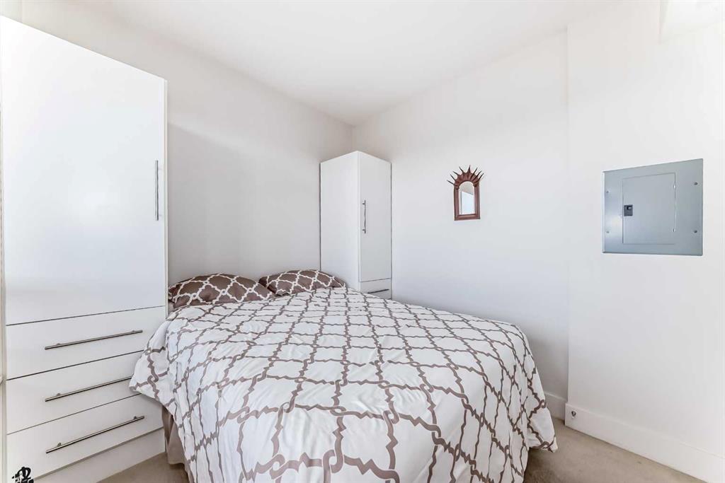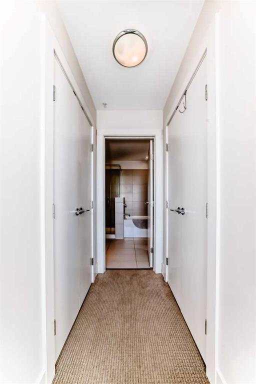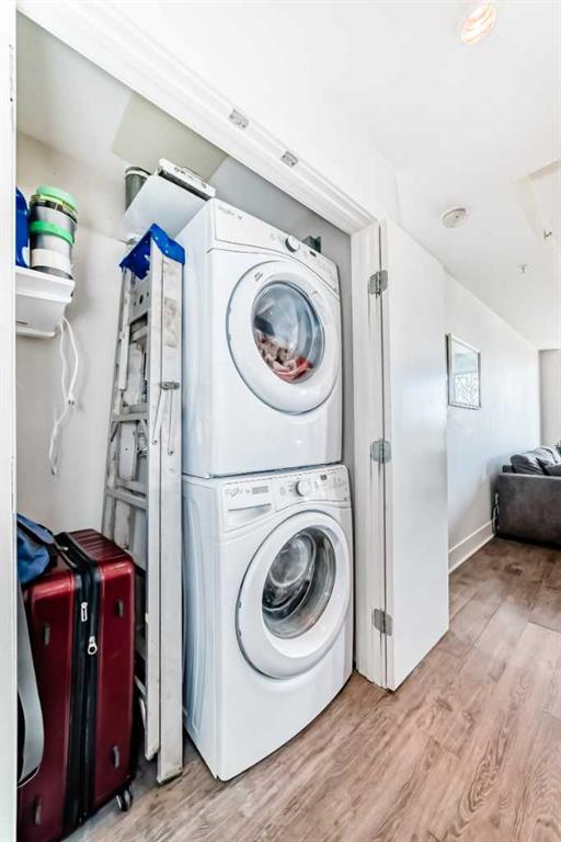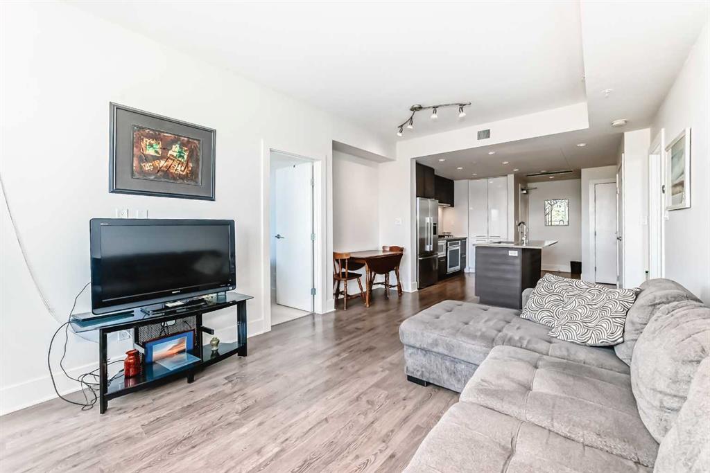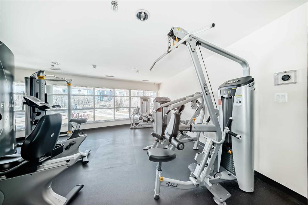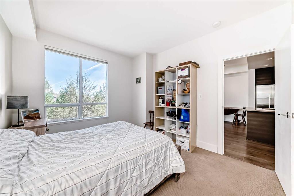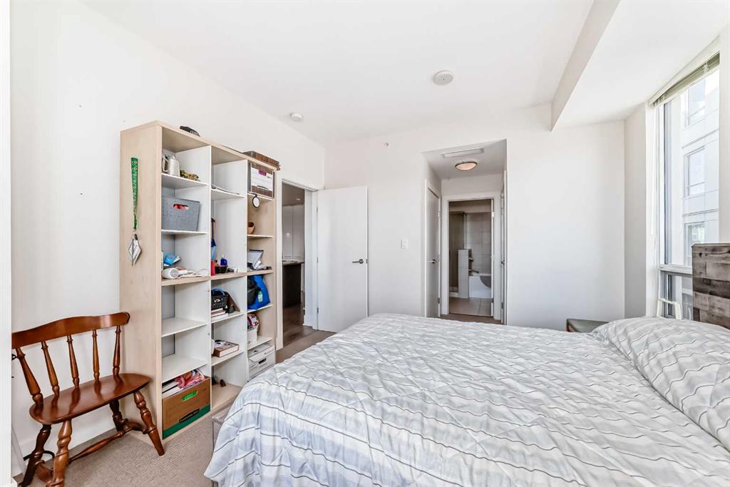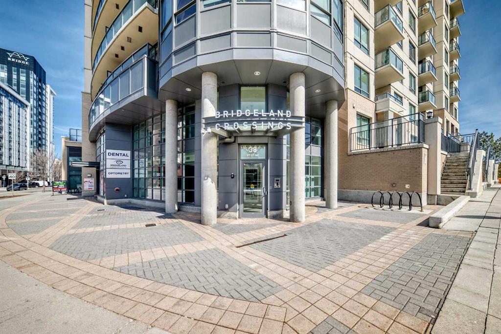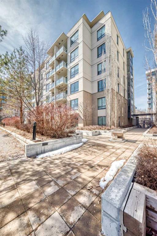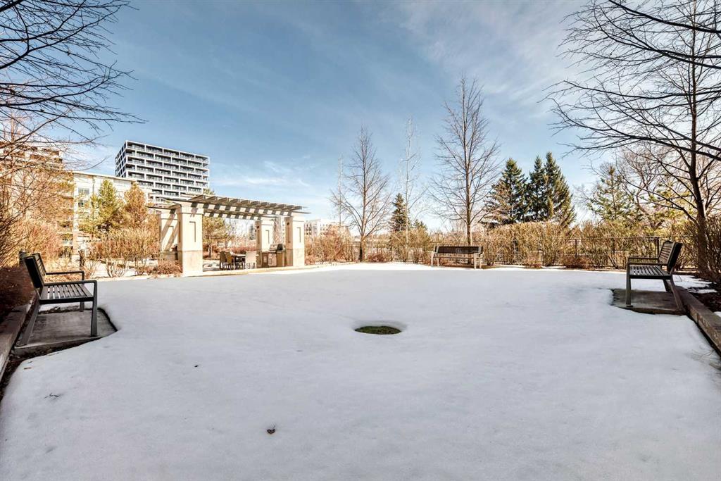 Super bright 2 bedroom condo overlooking the courtyard and community garden plots. East facing so great morning sun on the balcony. There is only one common wall allowing for lots of windows throughout. Shows like new with stainless steel appliances that includes a gas stove top. Quartz counter tops with loads of cabinets. Primary bedroom shares an ensuite , in-suite laundry. Good size second bedroom. A well managed building with amenities that include a gym, work room to service bikes, a wash bay for dogs, theater room, community gardens for the green thumb. Courtyard with a BBQ for entertaining. There is secure titled parking plus a storage locker and bike locker. All within a 5 min walk to the Bridgeland LRT.