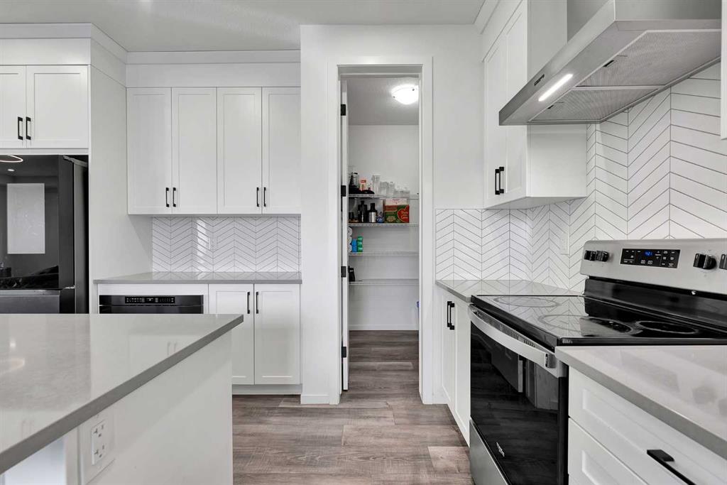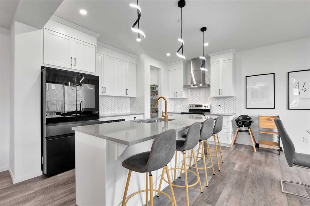 Step inside and be greeted by a bright, open-concept main floor featuring 9FT CEILINGS and VINYL PLANK FLOORING. The stunning kitchen impresses with QUARTZ COUNTERTOPS, a HERRINGBONE TILE BACKSPLASH, BLACK STAINLESS STEEL SMART FRIDGE, WALK-IN PANTRY, and a large ISLAND WITH SEATING—perfect for casual dining. The spacious living room with TRAY CEILING centers around a TILED GAS FIREPLACE WITH A MODERN MANTEL, while the adjacent dining area features PATIO DOORS TO THE DECK -ideal for BBQs and A SUNNY WEST-FACING BACKYARD.