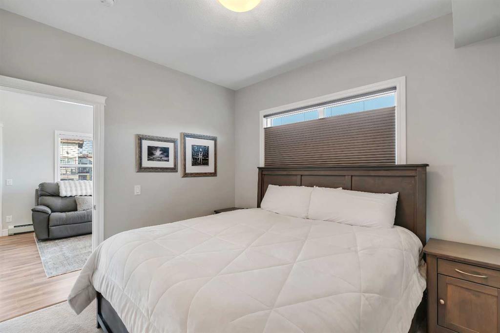 TWO parking stalls. Experience upscale living in this exceptional 2-bedroom, 2-bathroom top-floor corner unit in Seton. Featuring soaring 11-ft ceilings and an open layout, this condo offers an inviting atmosphere and expansive city and mountain views from a large balcony with a gas line for grilling. The modern kitchen is a showpiece with quartz countertops, ceiling-height cabinets & pantry offer ample storage, a large island perfect for entertaining, stainless steel upgraded appliances, and an in-sink water filtration system. The spacious primary bedroom offers a tranquil retreat with Hunter-Douglas blackout blinds, a spa-like ensuite with double vanities, walk-in shower, soaker tub, and a custom California walk-in closet. The second bedroom features its own custom built-ins by California closet, Hunter-Douglas blinds, and connects to a full bathroom. Extras include: AIR CONDITIONING, entryway and hallway closets, and a laundry closet with full-size washer & dryer, TWO parking stalls: one underground with storage, one surface stall steps from the stairs, central location near the South Health Campus, YMCA, high school, Superstore, Cineplex and more. This is luxury condo living at its finest—a rare find in Seton. Book your showing today!