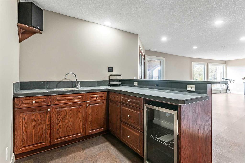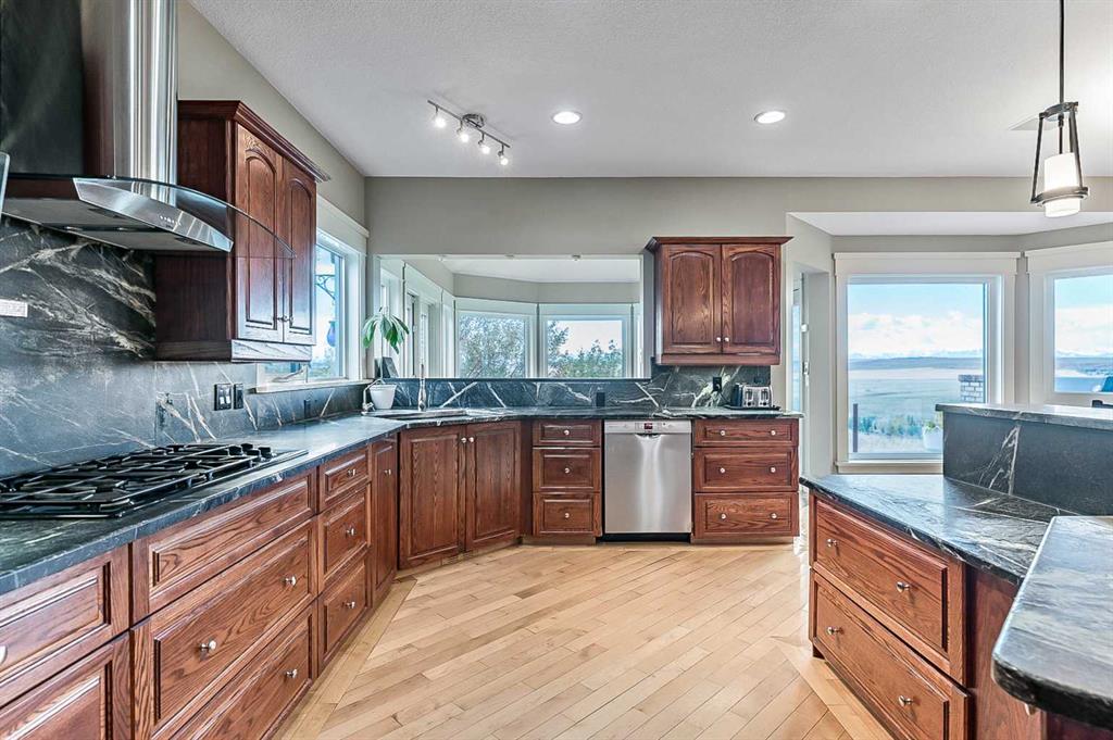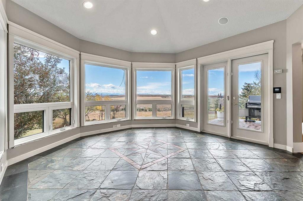 Imagine waking up to breathtaking panoramic views of the Rocky Mountains and rolling valleys, where the sun dips dramatically behind snow-capped peaks each evening—right from your west-facing windows. Nestled on over 55 acres of prime agricultural land in Rural Foothills County, this exceptional walk-out bungalow delivers 2,450 sq. ft. on the main level plus a fully developed basement, totaling 4,700 sq. ft. of luxurious living space. With 4 bedrooms, 4 bathrooms, office air conditioning, and thoughtful features like a large open kitchen, all-season sunroom/dining room flowing to expansive decks, vaulted living room with a stunning newer stone wood-burning fireplace, and premium hardwood, slate, and cork flooring throughout. The lower level boasts a family room with wet bar and wine cellar, dedicated media room, gym, abundant storage, and cozy lower deck access. Plus, an oversized attached double garage for all your needs.