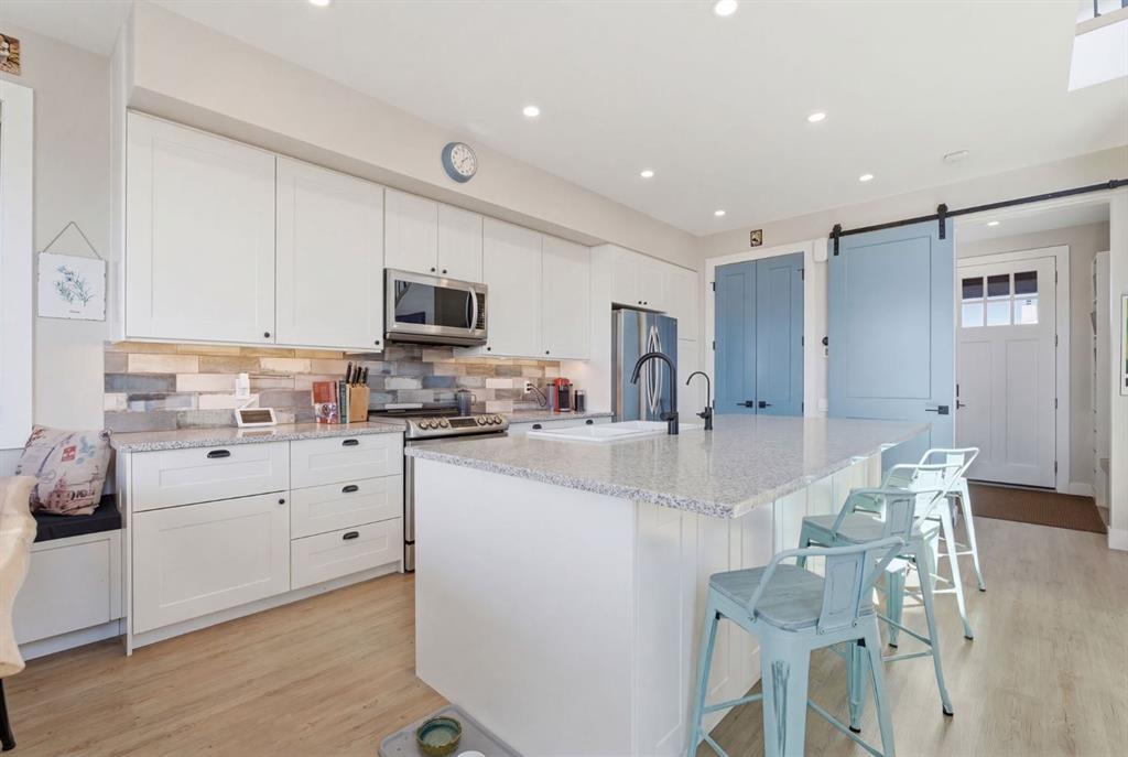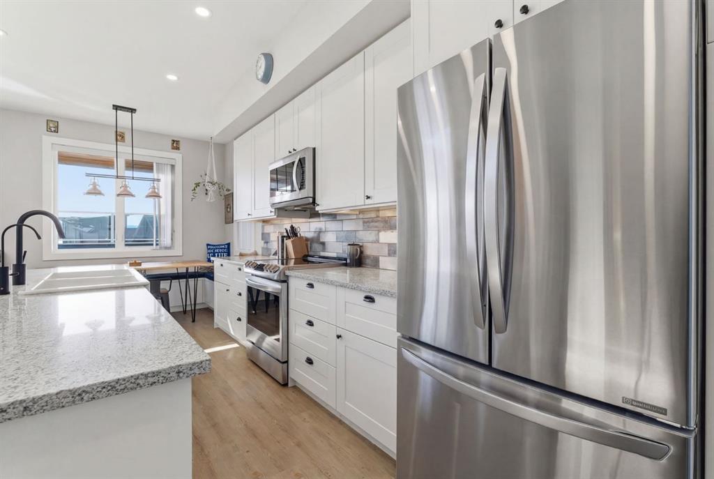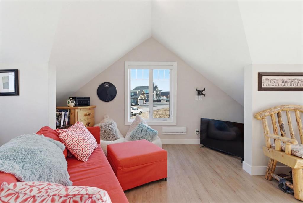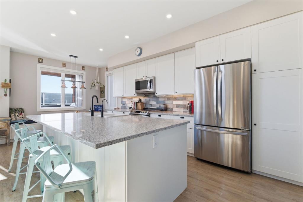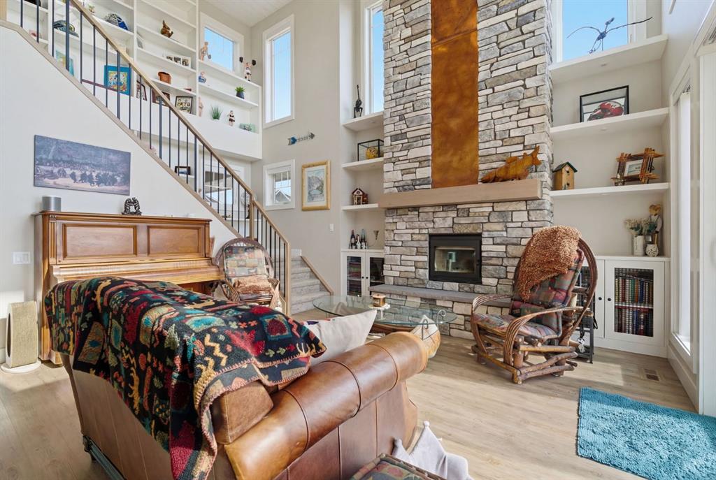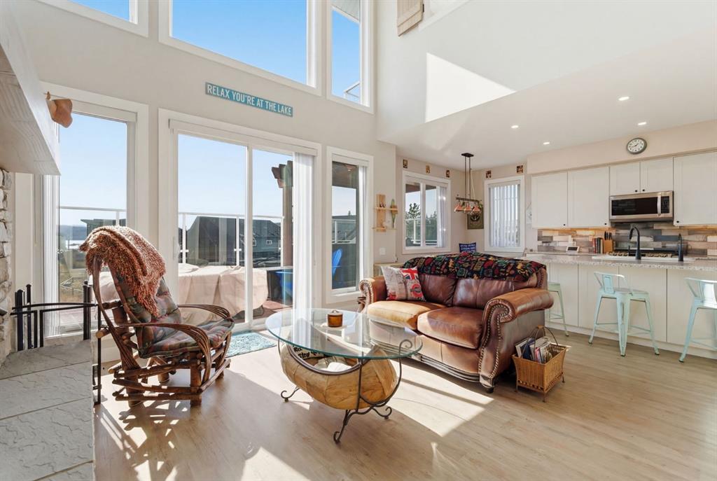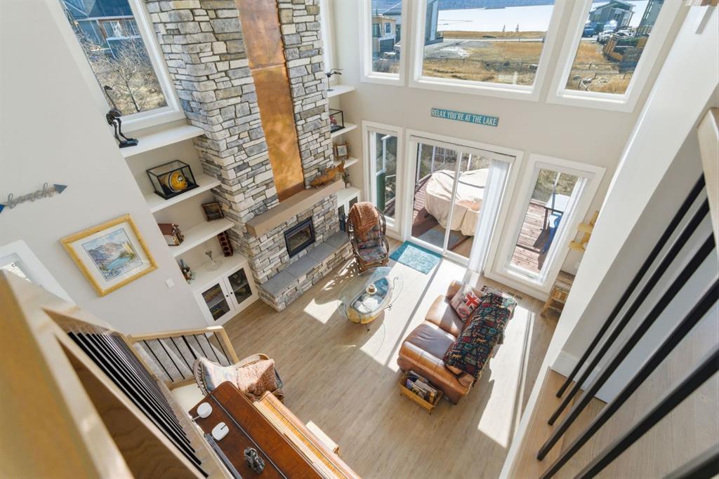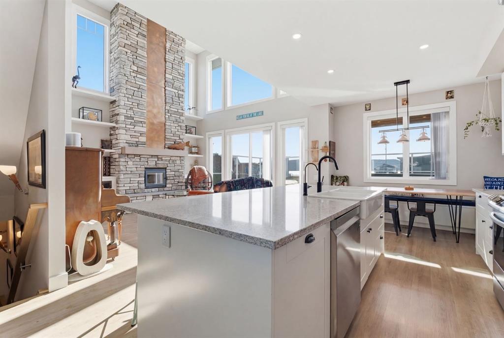 Welcome to CottageClub at Ghost Lake—where lake living meets mountain views and every day feels like an escape. Just minutes from Cochrane and an easy drive from Calgary, this vibrant, amenity-rich community offers the perfect balance of weekend retreat and full-time living. Built by Aura Quality Homes, this fully finished 1.5-storey walkout has been thoughtfully designed—offering space, flexibility, and highly elevated finishes throughout. Step inside and you’re immediately welcomed by an inviting entry with custom storage solutions and a stylish 2-piece bath. The heart of the home is the open-concept main living area, with soaring two-storey ceilings, a wood-burning stone fireplace with copper insert, and custom built-ins, adding both character and function. The kitchen is nothing short of impressive where attention to detail shines—from soft-close cabinetry and a stone backsplash to the oversized granite island with farmhouse sink. Added features like on-demand hot water and reverse osmosis elevate both comfort and convenience.Shiplap detailing and expansive triple-pane windows bring in natural light while framing the incredible views beyond.