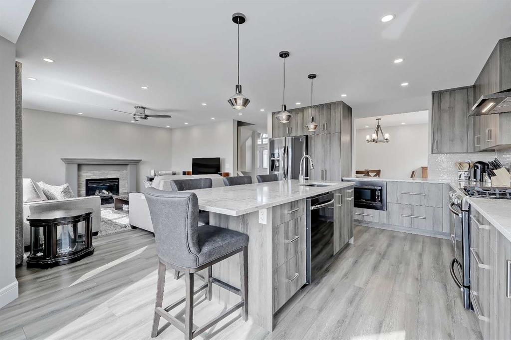 Designed for comfortable family living, the home feels both polished and practical from the moment you step inside. A bright front entry opens to the spacious dining area, thoughtfully opened to the kitchen to enhance light and connection throughout the main floor. The kitchen is a true highlight, featuring full-height custom cabinetry, a large island with seating, space for a breakfast table, quartz countertops, undermount composite sink, contemporary stacked tile backsplash, pendant lighting and new stainless-steel appliances including a 5-burner gas stove, chimney hood fan and built-in microwave. The main level also offers a bright living room with a gas fireplace overlooking the deck and yard, spacious laundry room with new cabinets, a half bath and access to the double attached garage.