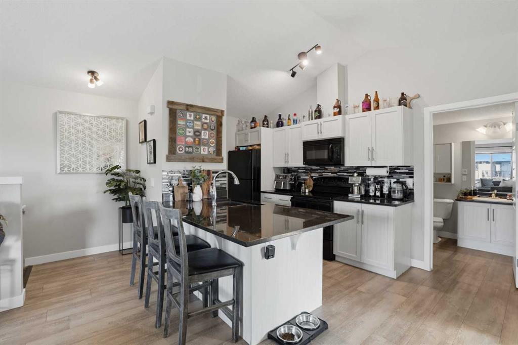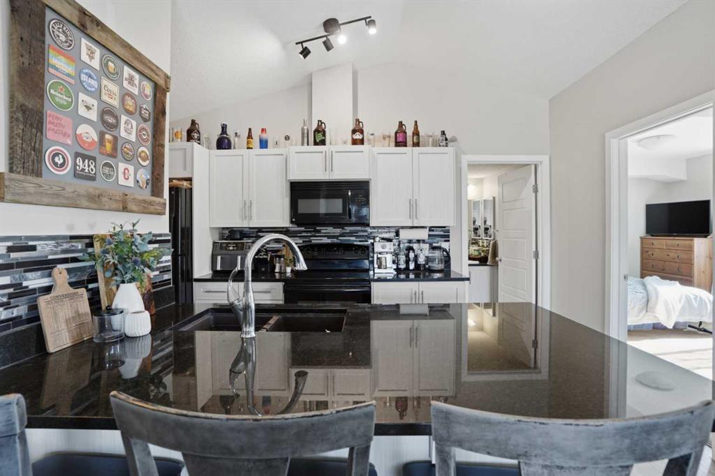 The main level foyer provides a private entrance and leads upstairs to a bright, open-concept living area featuring soaring vaulted ceilings and large windows that fill the home with natural light. The spacious kitchen is ideal for everyday living and entertaining, complete with granite countertops, black appliances, ample cabinetry, a closet pantry for extra storage, and a breakfast bar with barstool seating.