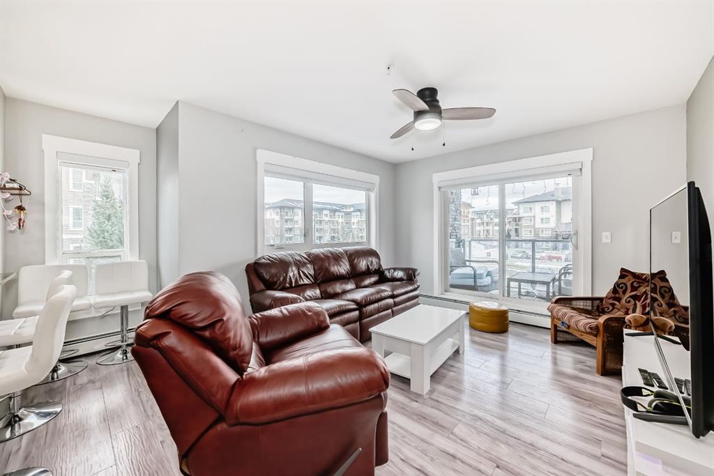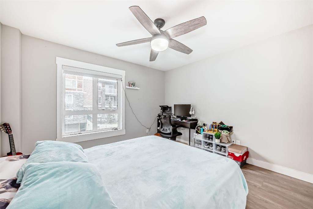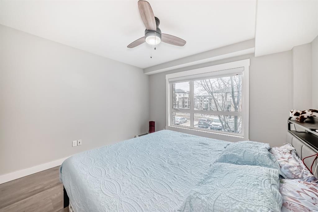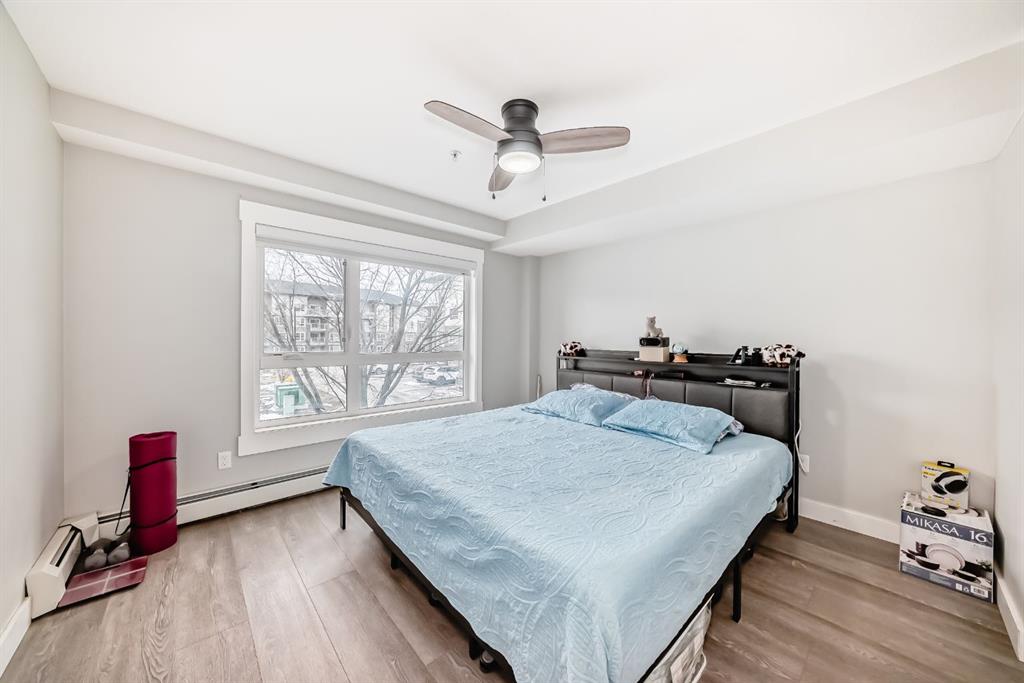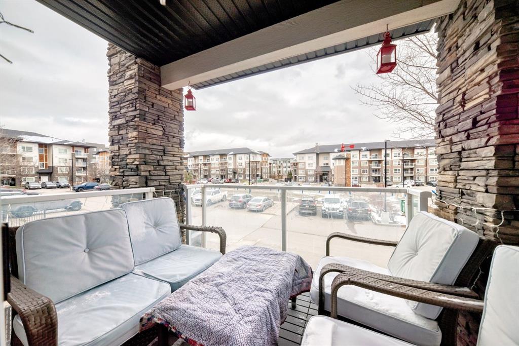 Welcome to this beautifully maintained and UPGRADED CORNER UNIT CONDO, located on the second floor offers over 943.5 sq ft of comfortable living space, featuring 2 spacious bedrooms, 2 full bathrooms, and the convenience of titled heated underground parking and secure caged storage locker. As you enter, you’ll be greeted by an open-concept design that includes a well-appointed kitchen, a dining area, and a versatile flex space perfect for an office. The kitchen is a chef’s dream, featuring a large counter with bar seating, granite countertops, stainless steel appliances. The owner has invested over $15k in upgrades including CUSTOM CABINETRY , HALL TREE ENTRYWAY BENCH ,COAT RACK with SHOE STORAGE, SMART LOCK for main DOOR , WATER PURIFIER ,SAMSUNG DISHWASHER, NEW LIGHT FIXTURES( Kitchen and dining) and BOTH WASHROOMS FIXTURES, New VINYL PLANK FLOORING (no carpet) has been installed throughout the unit, PATIO TILES, REMOTE CONTROLLED ZEBRA BLINDS for all windows and CEILINGS FANS in both bedrooms and Living room add extra convenience and comfort and beautiful Balcony to spend time with friends ,enjoying BBQ.Located in the vibrant Skyview Ranch community, this condo offers easy access to local amenities, parks, schools, shopping, and major roadways. Whether you’re a first-time homebuyer, a growing family, or someone looking for a modern, low-maintenance property,