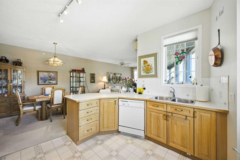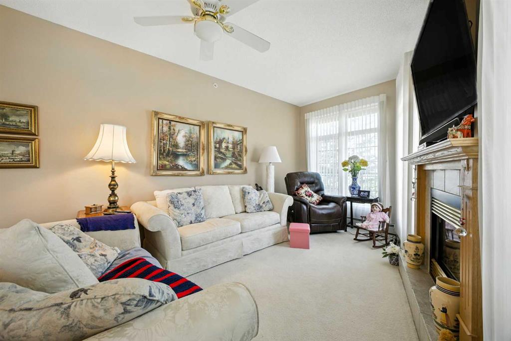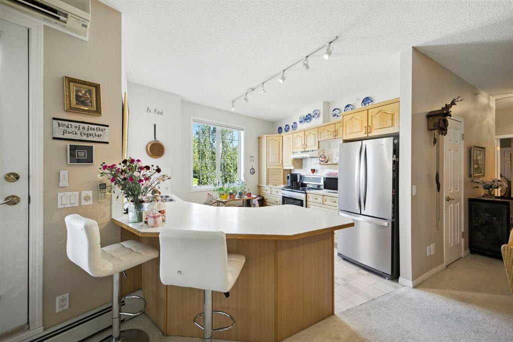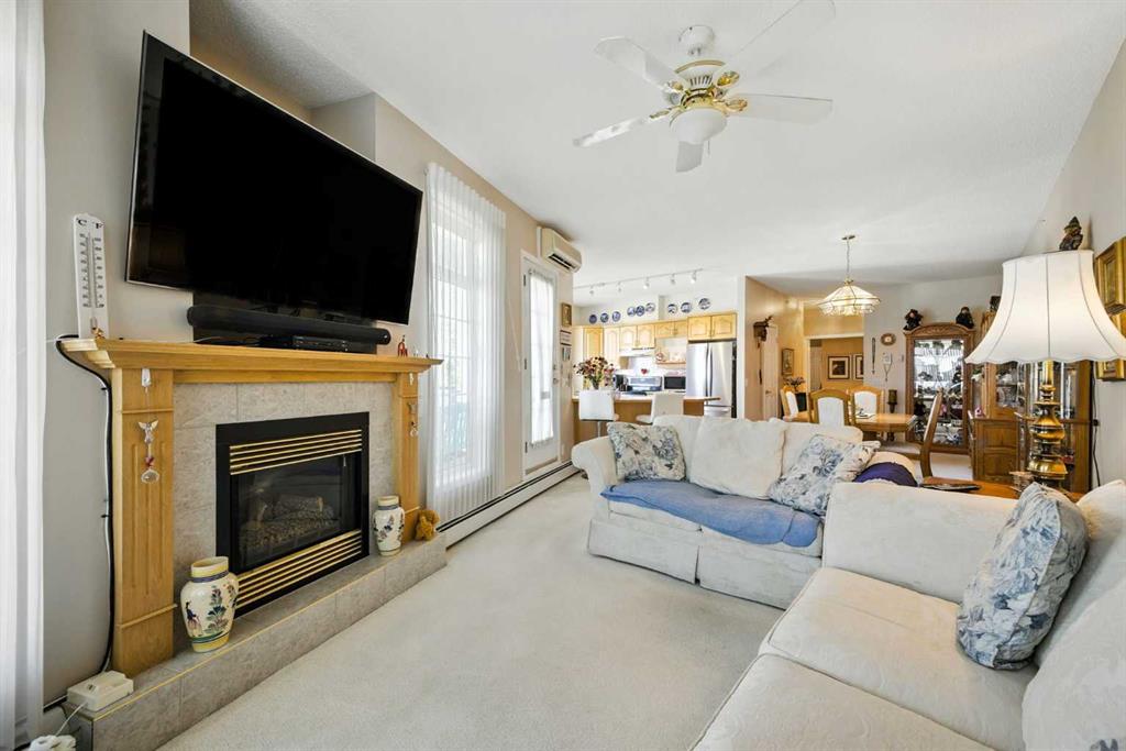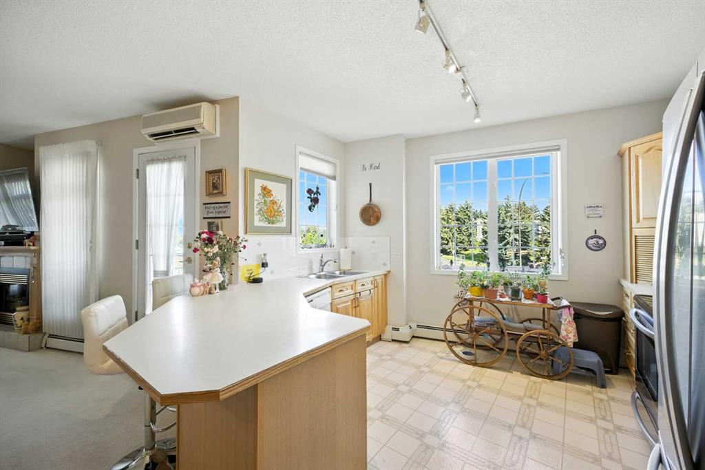 Welcome to this spacious 2-bedroom, 2-bathroom top-floor condo in a desirable 18+ complex, rich with amenities. Offering over 1,200 sq. ft. of bright living space, this home features a generous balcony with sweeping mountain views. Enjoy the comfort of two A/C wall units, a cozy gas fireplace, and an open kitchen with breakfast bar seating. Additional highlights include a new washer and dryer, central vacuum system, and electronic blinds in the living room. The layout is designed for convenience with in-suite laundry and the rare benefit of TWO titled parking stalls.
