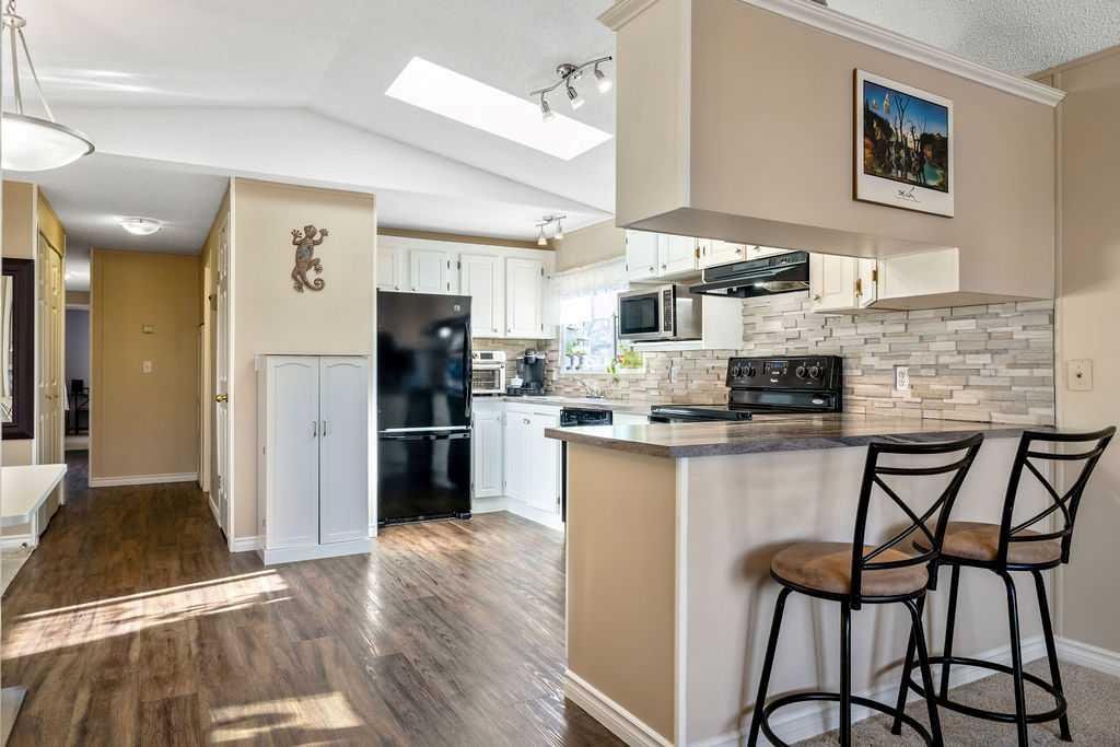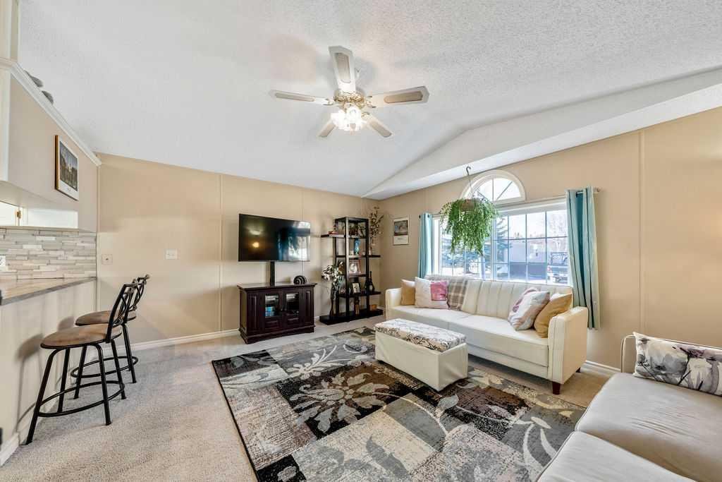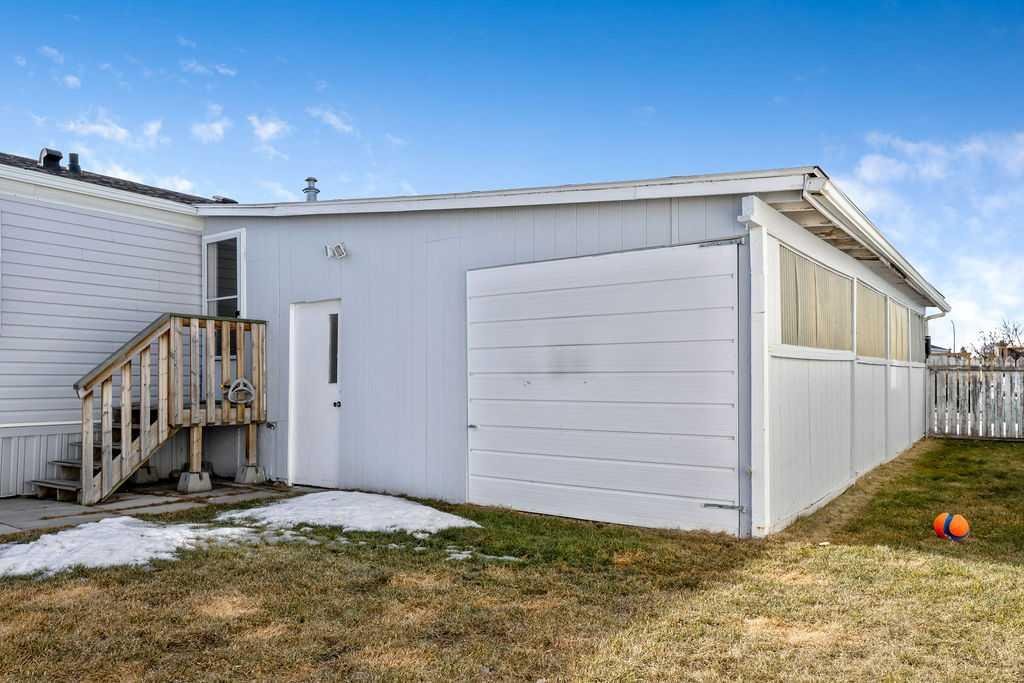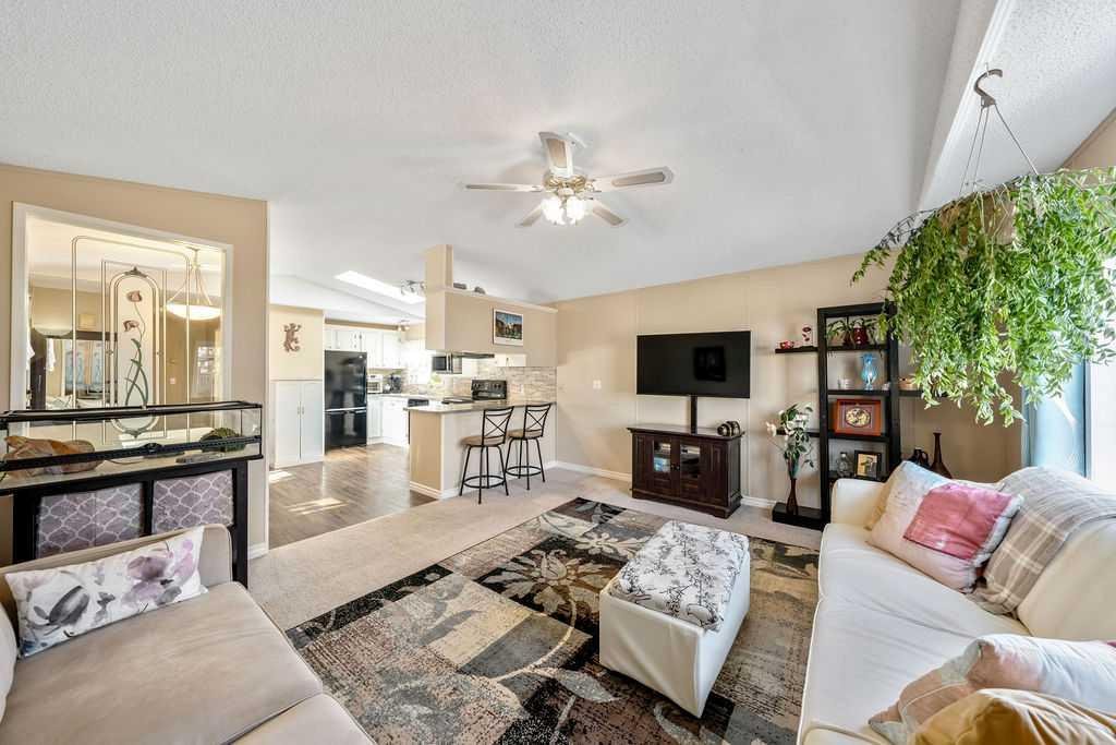 Unique opportunity to own a beautifully situated 1,034 sq. ft. single-wide mobile home set on a generously sized lot. The property offers outstanding outdoor functionality, including two large exterior sheds—ideal for storing motorcycles, snowmobiles, 4-wheelers, and other outdoor toys or seasonal equipment. There’s also a large paved driveway accommodating two vehicles, plus the bonus of an attached 2 vehicle carport. The cozy interior features vaulted ceilings and a skylight that floods the main living area with natural light, creating a bright, open, and welcoming atmosphere. You’ll also appreciate the abundance of cabinetry and generous counter space—perfect for everyday living. The thoughtful layout includes 2 bedrooms and 2 bathrooms, both generously sized with a huge covered deck attached. Enjoy living right in the heart of Okotoks, just steps from parks, pathways, historic downtown, the recreation centre, and shopping. Lot fees of $1,270/month include water, sewer, garbage, compost, recycling, and snow removal. Buyer approval is required by Cove Communities (see member remarks for additional details). Don’t miss this rare opportunity to enjoy tons of outdoor space, open concept living, storage, natural light , and the quaint lifestyle of Okotoks.