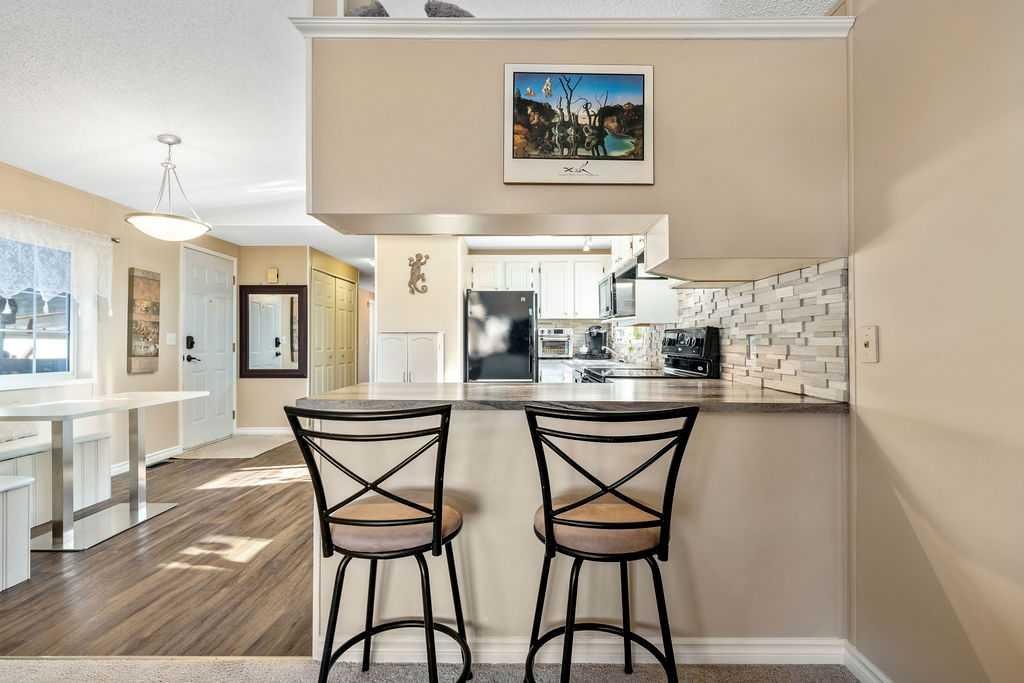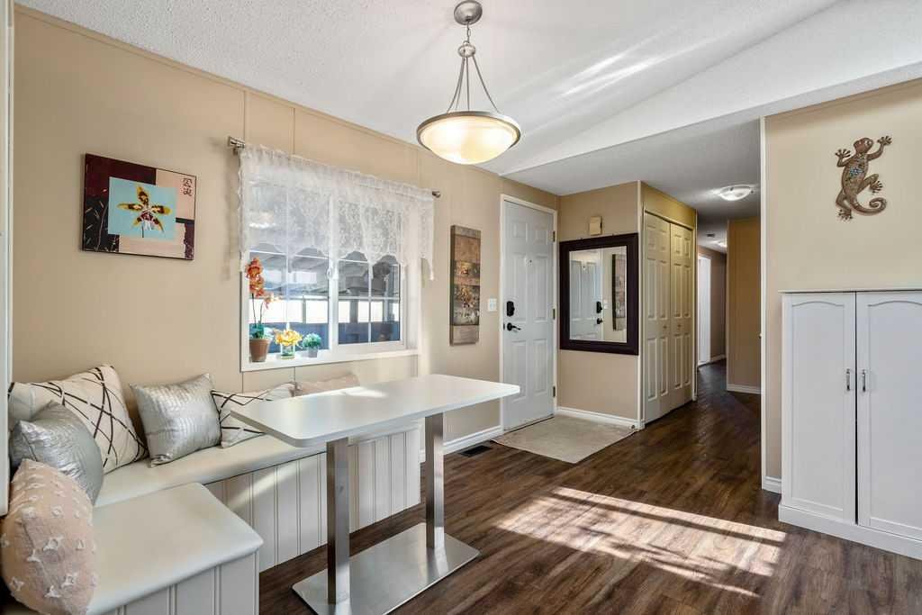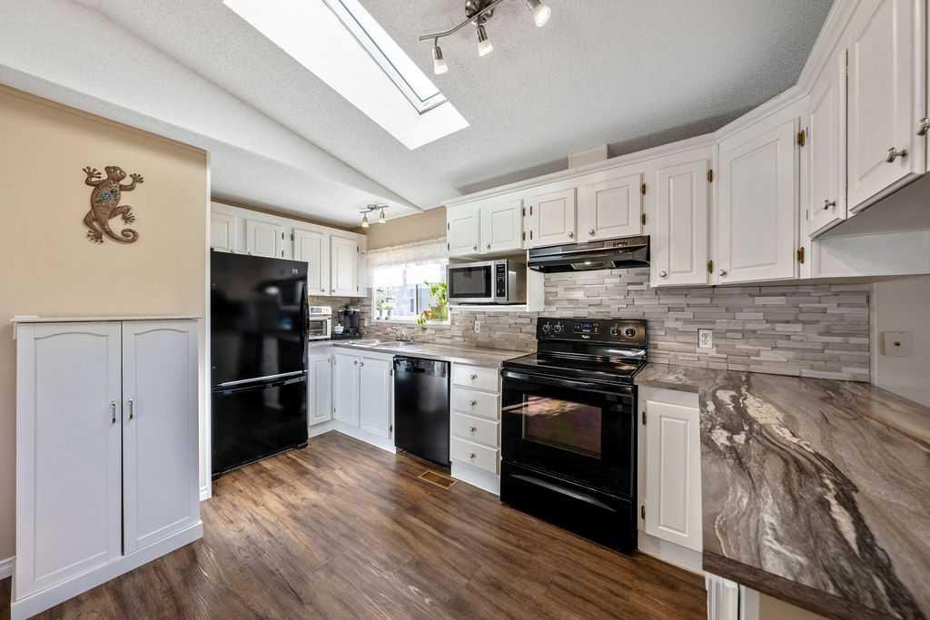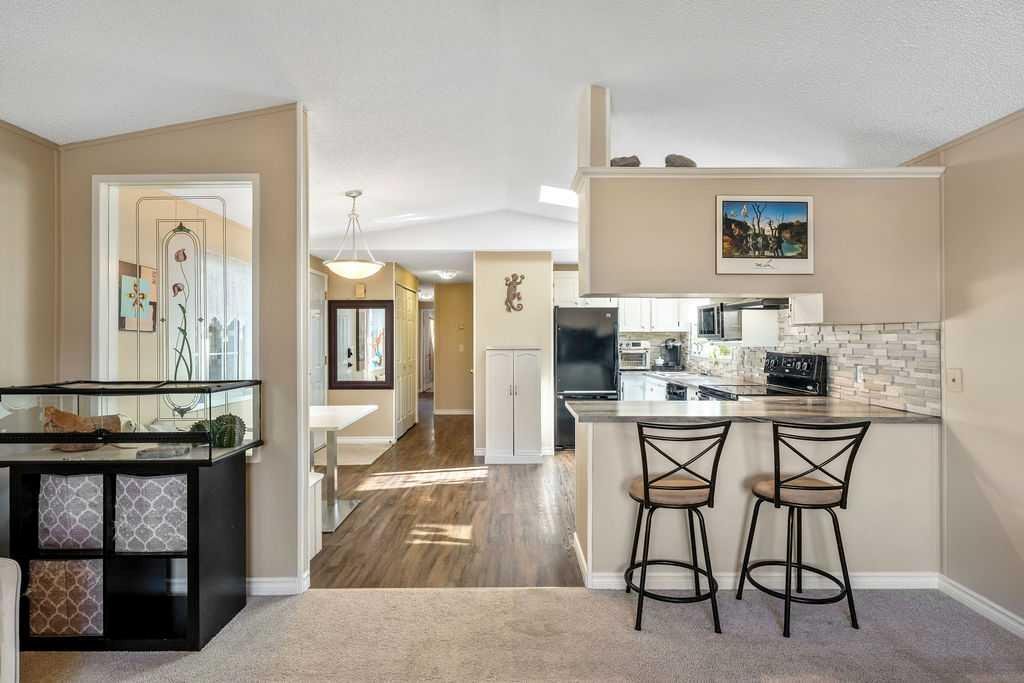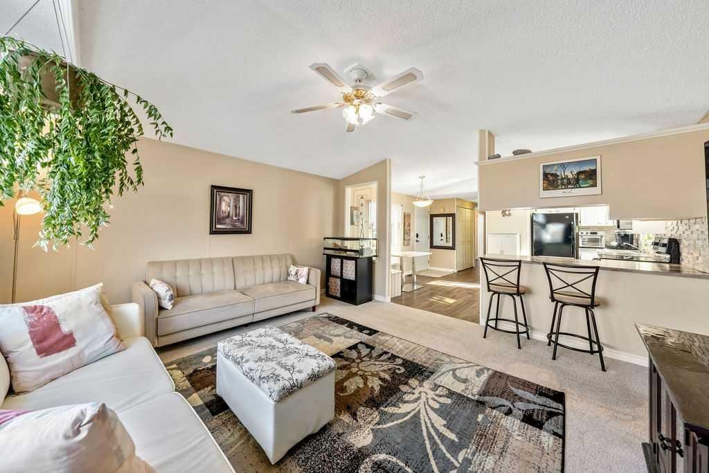 Unique opportunity to own a beautifully situated 1,034 sq. ft. single-wide mobile home set on a generously sized lot. The property offers outstanding outdoor functionality, including two large exterior sheds—ideal for storing motorcycles, snowmobiles, 4-wheelers, and other outdoor toys or seasonal equipment. There’s also a large paved driveway accommodating two vehicles, plus the bonus of an attached 2 vehicle carport. The cozy interior features vaulted ceilings and a skylight that floods the main living area with natural light, creating a bright, open, and welcoming atmosphere. You’ll also appreciate the abundance of cabinetry and generous counter space—perfect for everyday living. The thoughtful layout includes 2 bedrooms and 2 bathrooms, both generously sized with a huge covered deck attached. Enjoy living right in the heart of Okotoks, just steps from parks, pathways, historic downtown, the recreation centre, and shopping. Lot fees of $1,270/month include water, sewer, garbage, compost, recycling, and snow removal. Buyer approval is required by Cove Communities (see member remarks for additional details). Don’t miss this rare opportunity to enjoy tons of outdoor space, open concept living, storage, natural light , and the quaint lifestyle of Okotoks.