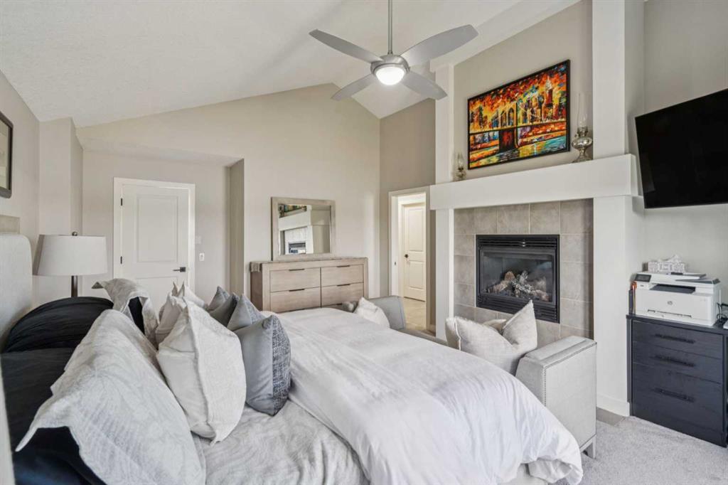 Upstairs, new carpets (2023) with 10lb underlay lead to four spacious bedrooms, each outfitted with CUSTOM CALIFORNIA CLOSETS. The primary bedroom impresses with VAULTED CEILINGS, a BUILT-IN DESK, FIREPLACE, and spa-like ensuite featuring QUARTZ COUNTERS, DOUBLE SINKS, JETTED TUB, and TILED SHOWER. The renovated guest bath offers QUARTZ COUNTERS, DOUBLE SINKS, and a BUILT-IN LINEN CLOSET, while the laundry room adds cabinetry and counters for convenience.