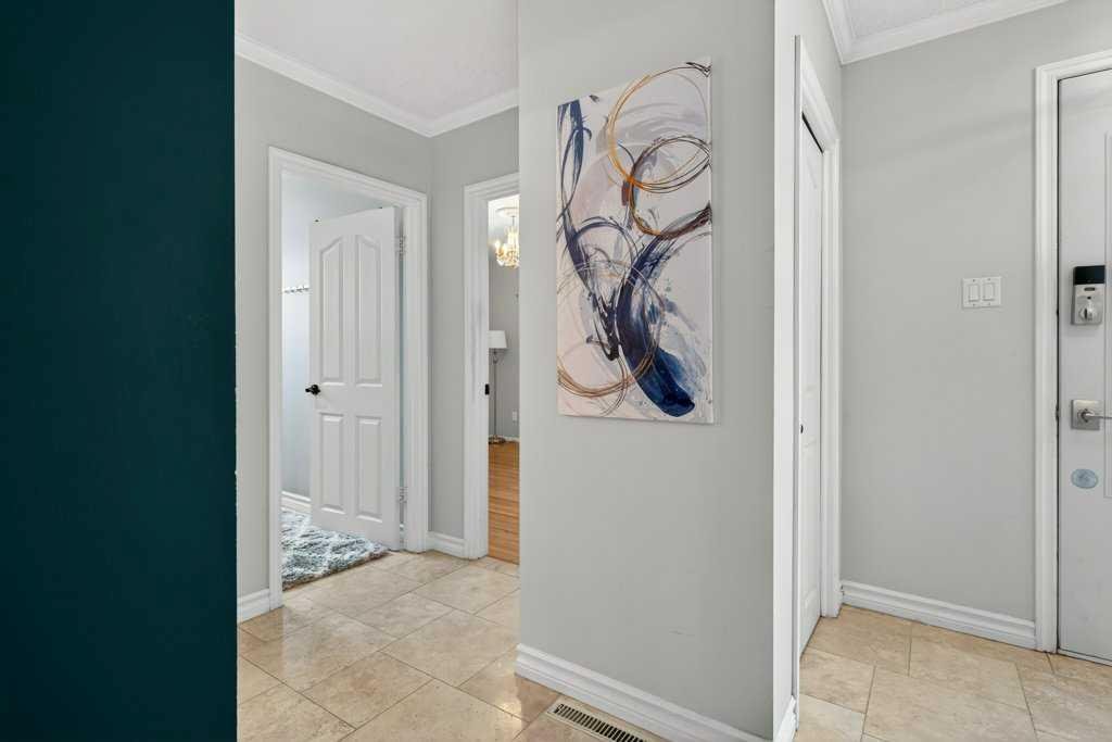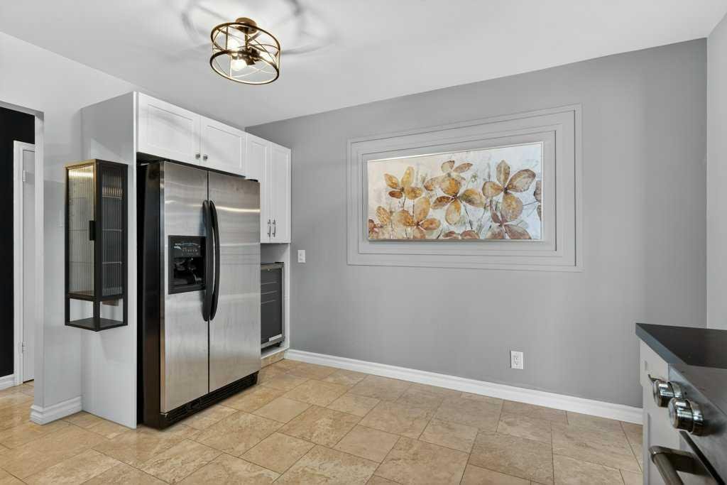 Step inside to a bright, open main floor featuring a fully renovated kitchen (2022) with white shaker cabinetry, stainless steel appliances (including a convection oven and fridge with water/ice), dimmable pot lights, and smooth painted ceilings. The main bathroom has been completely transformed with a custom vanity and a luxurious glass walk-in shower.