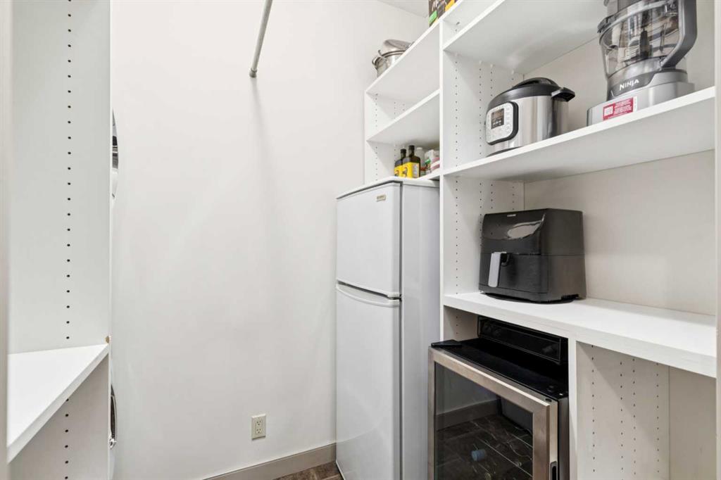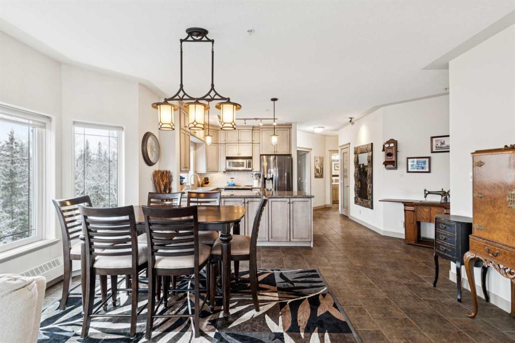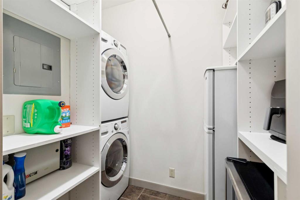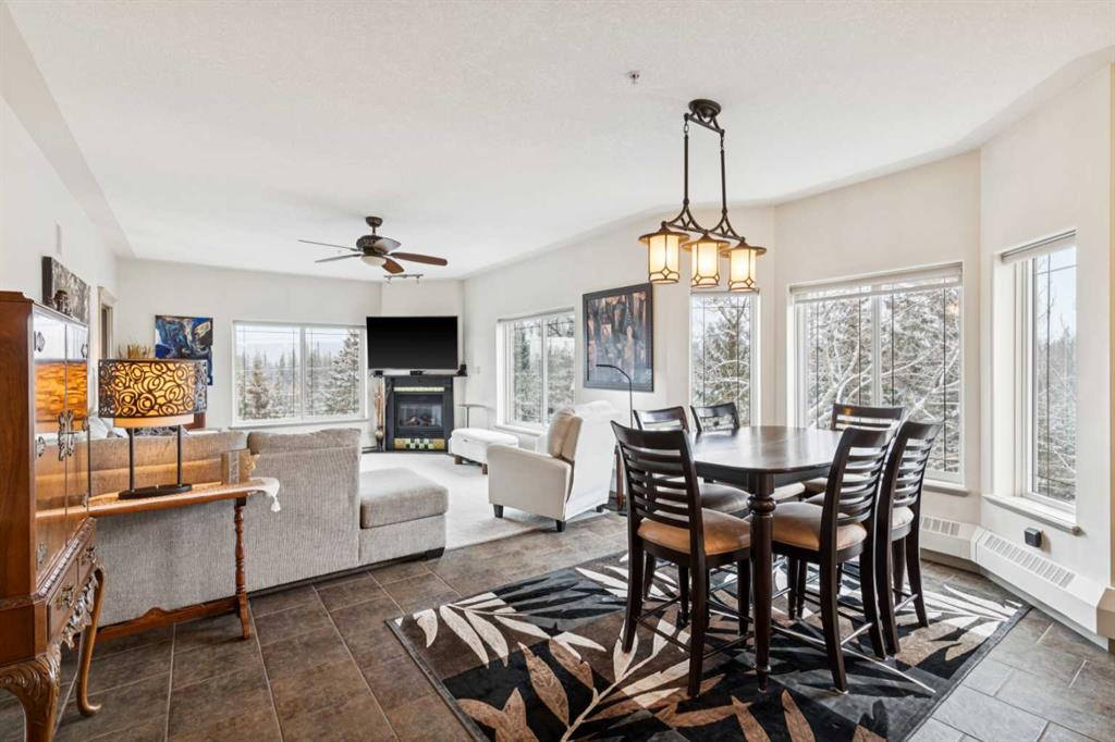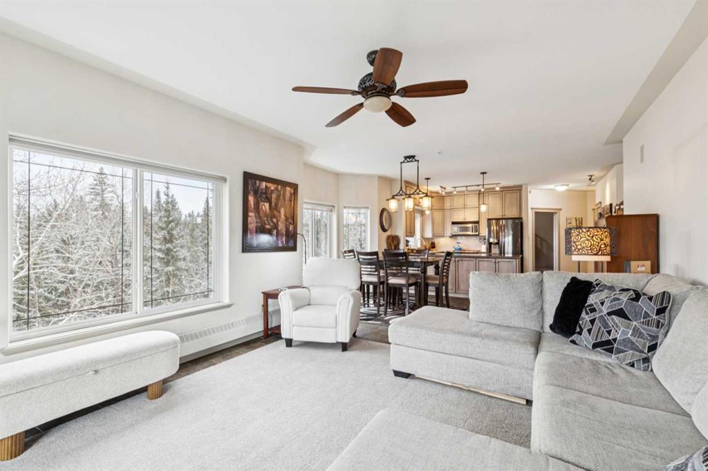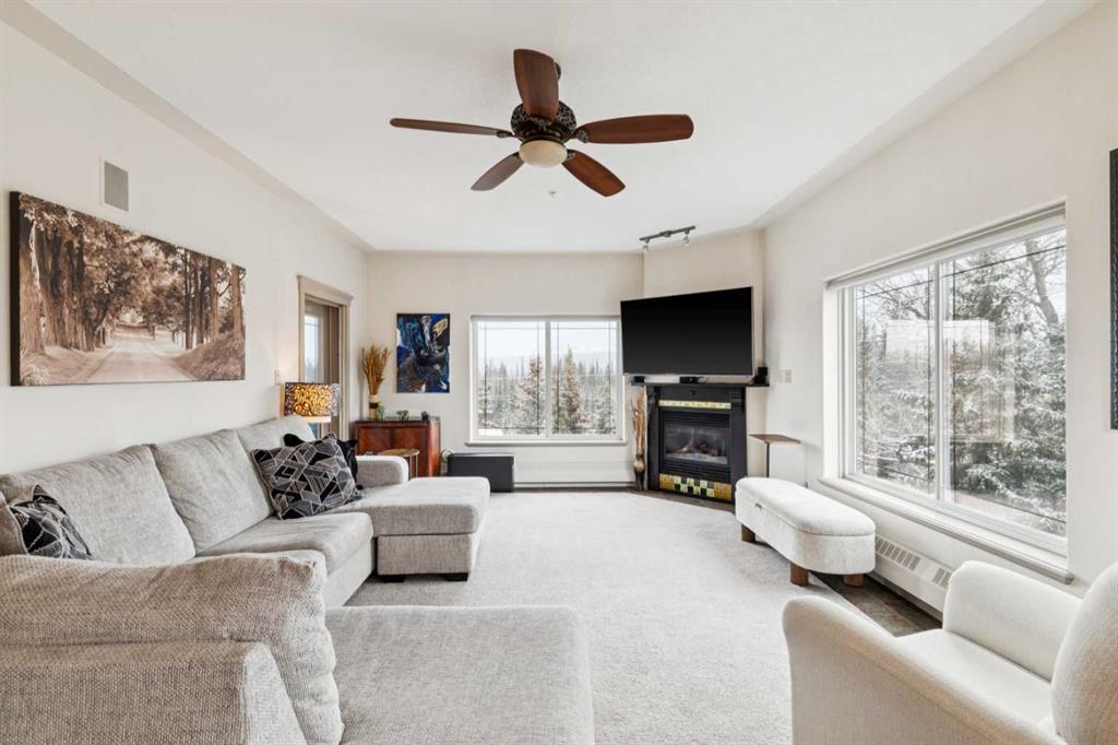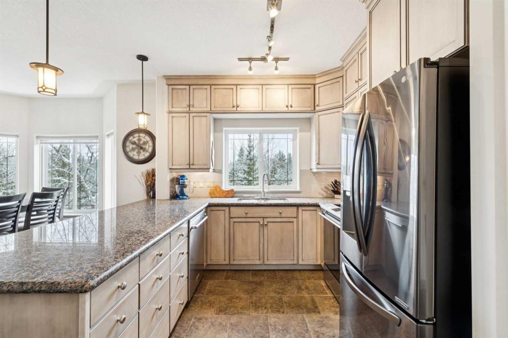 Rarely does a condo this spectacular ever become available for purchase. This expansive corner unit perched on the 4th floor boasts incredible views of Griffith Woods, the river and nature, with abundant natural light & warmth, just above the treetop elevation. Every single room offers something unique and special, simply unmatched by any other unit. With 9ft ceilings, walls of windows, total privacy and high end, updated appliances and design, this 1372 SqFt condo offers the best of condo living, in the best location. A generous foyer greets you with double closet and flows down the hallway with feature built in shelving. Convenient, spacious laundry room is on one side, along with the central 3pc bathroom. A spacious bedroom overlooks the trees with enough space for various layouts. The beautiful kitchen features full height cabinets & back splash, undermount lighting, pendant lighting, quartz countertops and high end s/s appliances including a newer induction cooktop range. There is also a dedicated pantry and under counter storage for optimal convenience. The main kitchen, dining and living rooms blend together while overlooking the serenity and beauty of nature, with blue jays, owls, wildlife and the winding river below. Enjoy the views in total privacy with a cozy corner fireplace or the covered balcony where every day feels like you are living in a mountain resort dream. The primary bedroom overlooks the river, features a generous walk through closet and large 4pc ensuite. An additional assigned storage is located with the excellent titled parking space right near the elevator. There are incredible walking paths, tennis/pickle ball courts and a fitness facility in the complex. Well managed and offered in absolutely pristine condition. This is a special condo for the most discerning buyer. The views, layout and move-in ready condition will take your breath away. Welcome home!