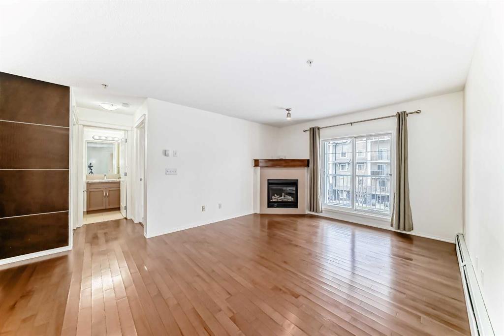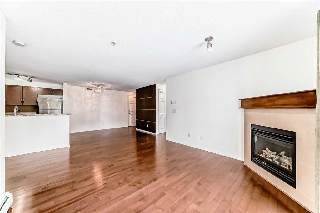 Welcome to Prestwick Place in McKenzie Towne—an updated, contemporary apartment-style condo offering 841 sq. ft. of comfortable, open-concept living just minutes to schools, parks, and shopping. Hardwood flooring flows through the main living space, where a bright open kitchen features stainless steel appliances, and an island. The spacious living room is anchored by a cozy fireplace with direct access to the balcony—perfect for morning coffee or evening downtime. The thoughtful layout includes two generous bedrooms, with the primary including a walk-in closet and 4-piece ensuite, plus a versatile den ideal for a home office or storage. Recent updates include fresh paint, new countertops, a newer dishwasher, and a newer microwave/hood fan. Finished with in-suite laundry. One indoor titled parking stall with a storage locker. Some photos have been virtually staged to give you an idea of what you can do with this great space. Condo fees: $461.43.