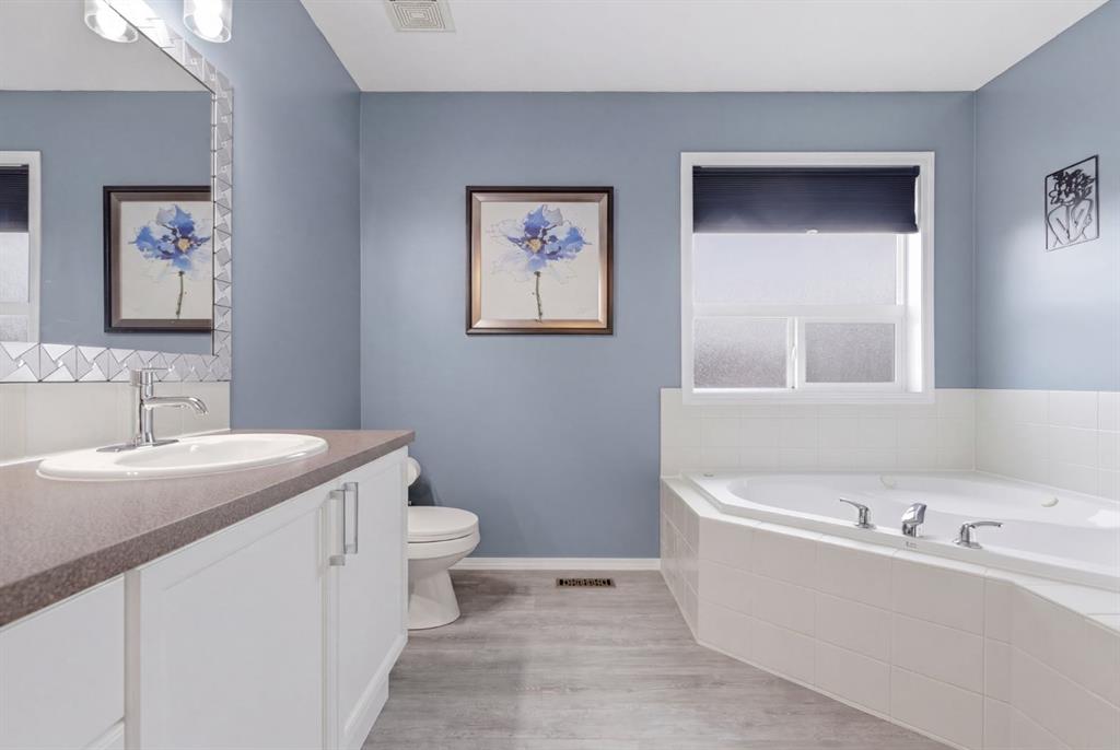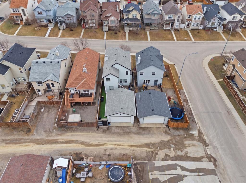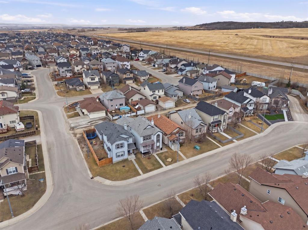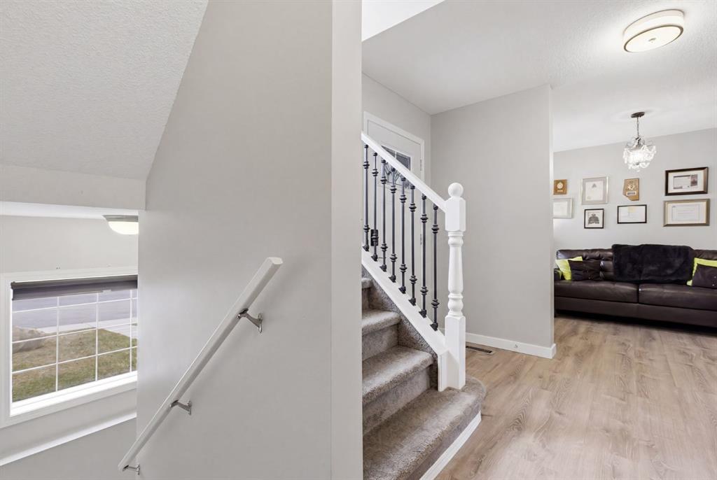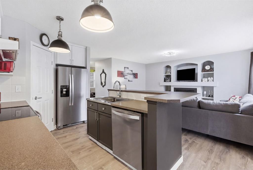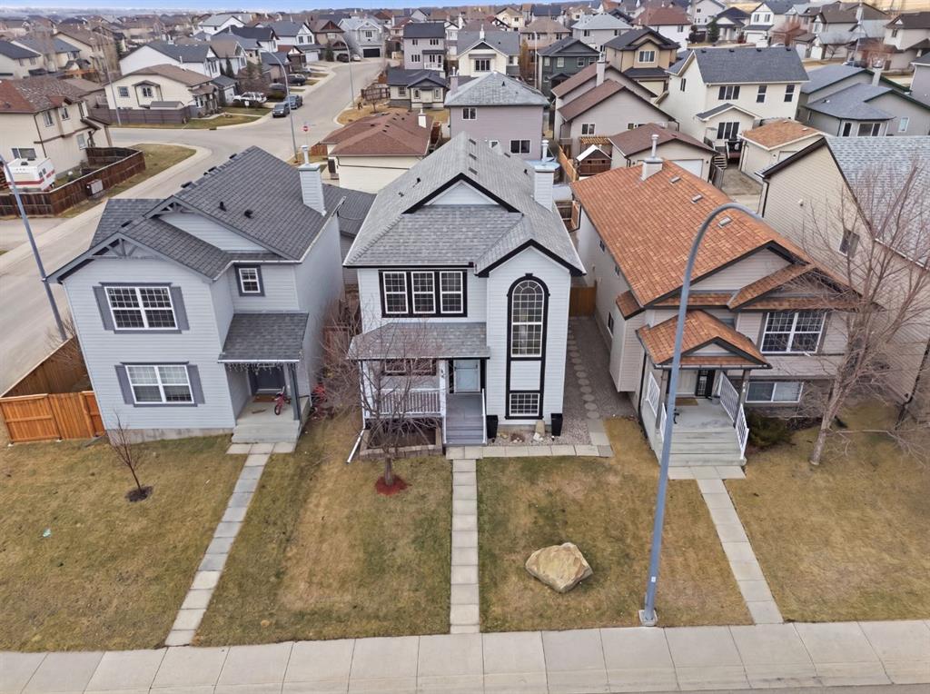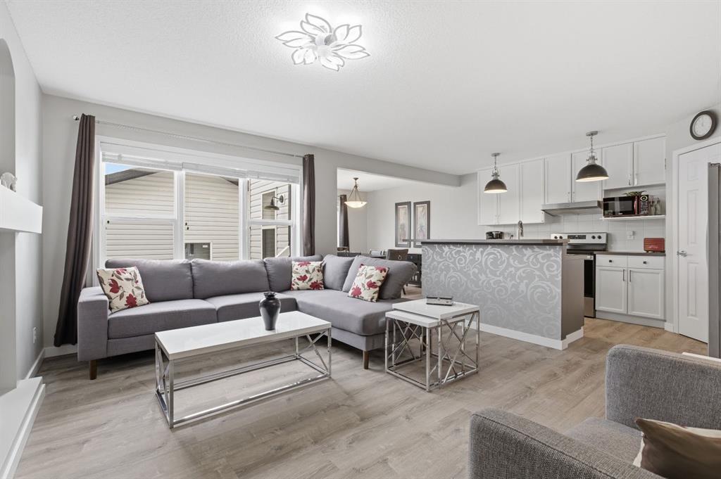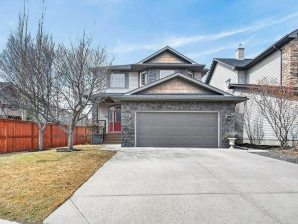 Live in the family friendly community of Cimarron. This cleverly laid out home is situated on a quiet street. As you approach you will appreciate the attractive curb appeal and inviting front porch. Throughout the home, pride of ownership is clear, with plenty of updates such as new vinyl plank flooring, stylish light fixtures, and an elegant railing. The kitchen is a focal point, boasting cabinets that reach to the ceiling, a tasteful tile backsplash, stainless-steel appliances, and a corner pantry for added storage. The large island seamlessly connects to the expansive living room, which features a gas fireplace with custom built in detail. Adjacent to the kitchen, the dining room is filled with natural light from numerous windows and provides direct access to your private backyard. This low maintenance yard has a large patio, artificial grass, a new fence and a double detached garage. The main floor is complete with a powder room tucked away as well as a front den, perfect for a home office, additional living room or kids’ playroom. Upstairs, you’ll find two generously sized bedrooms, a full 4-piece bathroom, and an expansive primary retreat. The primary suite is a true sanctuary, offering a large walk-in closet and a private ensuite with a luxurious jetted corner tub, separate shower and expansive vanity. The lower level is framed and prepped for easy future development. This home is ideally located within walking distance to schools, parks, pathways, shopping, and professional services. Schedule your private showing or view the virtual tour today.