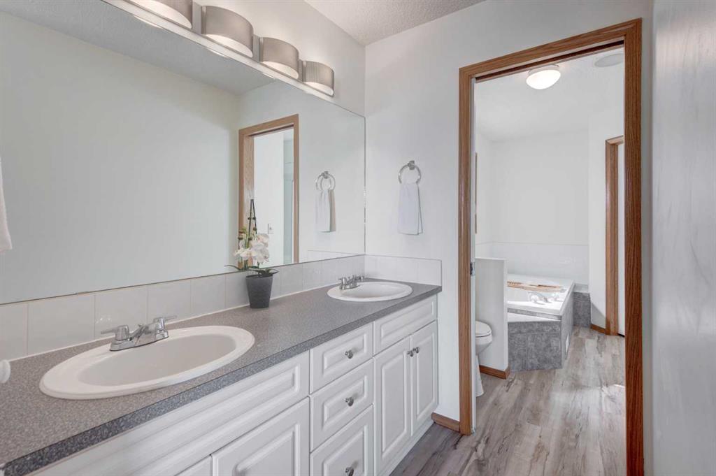 OPEN HOUSE Sat April 11th 2:00PM – 4:30PM *** This Turn-key three-bedroom, three-bathroom walk-out bungalow is located in a quiet Somerset cul-de-sac & backing onto the Green Belt. With over 2,462 square feet of finished living space, the home features an open-concept layout filled with natural light. A three-sided gas fireplace sits between the living room and formal dining area, providing a nice focal point for the main floor. The kitchen includes plenty of cabinetry, a pantry, and a breakfast nook for casual meals. The primary suite offers a large walk-in closet and a five-piece ensuite equipped with dual vanities, a jetted tub, and a separate shower. A second bedroom and another full bathroom complete the main level. Downstairs, the finished walk-out basement serves as a great space for hosting, featuring a games area, and a family room with a second fireplace. This floor also contains the third bedroom, which has a walk-through closet leading to a 4-piece guest bathroom. Outside, the elevated rear balcony and covered lower patio overlook a fenced yard that backs directly onto greenspace and walking paths. Practical features include a double front-attached garage and a wide driveway with parking for two extra vehicles. New Water Heater (2021), Siding (2021), Roof (2016), LVP Floors main (2022), A/C & Furnace (2016) This property is situated close to schools, shopping, Splash Park, the YMCA, and transit links. It is a solid, move-in-ready house in a convenient location. Book your showing today.