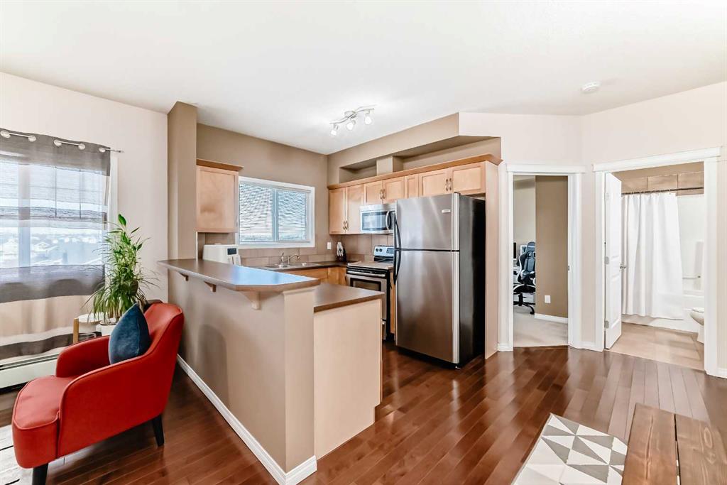 Welcome to this stunning TOP-FLOOR CORNER condo in Lighthouse Landing, offering exceptional privacy, natural light, and beautiful views from your semi-circular covered balcony. This immaculate home features 2 bedrooms and 2 full bathrooms, and an indoor underground parking, thoughtfully designed with no shared walls between bedrooms for added comfort. Inside, you’ll find a bright and spacious and functional layout highlighted by high-end engineered flooring, maple cabinetry, and stainless steel appliances. The inviting living room is anchored by a corner gas fireplace, creating the perfect space to relax or entertain, while the balcony gas line makes outdoor grilling a breeze. The main living area is warm and inviting, perfect for relaxing or hosting, while large windows bring in plenty of natural light throughout the home. The kitchen is efficiently designed with ample cabinetry and workspace, flowing seamlessly into the dining and living areas for easy everyday living. This home features two well sized bedrooms, including a primary retreat complete with its own ensuite and walk-in closet, offering both privacy and practicality. Enjoy your own private balcony, ideal for morning coffee or unwinding at the end of the day. With in suite laundry and a smart layout all on one level, this home is perfect for low maintenance living. Located in the highly desirable community of Country Hills Village, residents enjoy a walkable lifestyle with easy access to park, pond, shopping, restaurants, groceries (Superstore, Sobeys), medical & dental services, schools, library, public transit, and recreation, including the nearby Vivo Recreation Centre, Landmark Cinema, Commuters will appreciate quick connections to Stoney Trail and Deerfoot Trail, with CrossIron Mills just minutes away and the airport only a short drive. This is an ideal opportunity for first time buyers, downsizers, or investors looking for a property in a prime, amenity rich location. This is condo living at its finest—comfort, convenience, and style all in one.