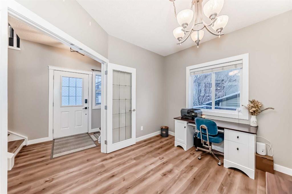 features major recent upgrades, including a new roof in 2021 for ultimate peace of mind. Step inside to a refreshed main floor showcasing brand-new LVP flooring, a designated office/flex space, and convenient main-floor laundry hookups. The open-concept living area is an entertainer’s dream, featuring a kitchen with quartz countertops and a large pantry, a dining area that opens to your beautiful backyard oasis, and a cozy living room anchored by a gas fireplace. Upstairs, you’ll find an oversized bonus room complete with an electric fireplace and stunning mountain views. The spacious primary suite is a true retreat with a 5-piece ensuite and walk-in closet. Two additional good-sized bedrooms and another full bathroom complete the upper level. The fully finished basement provides even more living space, offering a family rec room, a wet bar, a flex room, ample storage, and a 3-piece bathroom. Perfectly located close to parks, pathways and a beautiful golf course. Enjoy the best of quiet, small-town living with a quick and easy commute to Airdrie and Calgary. This one is a must-see!