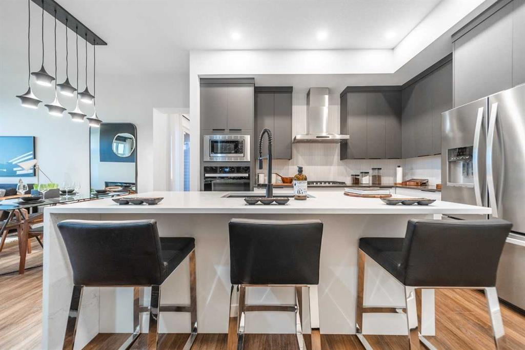 This home showcases on-trend, designer-curated interior selections tailored for a home that feels personalized to you. Energy efficient and smart home features. A beautifully upgraded home backing onto tranquil greenspace. This stunning property features an executive kitchen with built-in stainless steel appliances, gas cooktop, fridge with water and ice, a waterfall island with waste-bin pullout and a pantry with MDF shelving. Enjoy 10′ ceilings in main living areas, LVP flooring, a main floor flex room, and an electric fireplace with mantle. The primary bedroom offers wall detail, MDF shelving in the WIC, and a 5-piece ensuite with tiled walk-in shower, tile flooring, barn door, and a bank of drawers. With additional windows, black hardware, a developed stairwell, 9′ basement ceilings, and a rear deck with BBQ gasline rough-in, this home blends luxury and comfort. This energy-efficient home is Built Green certified and includes triple-pane windows, a high-efficiency furnace, and a solar chase for a solar-ready setup. With blower door testing that may be eligible for up to 25% mortgage insurance savings, plus an electric car charger rough-in, it’s designed for sustainable, future-forward living. Featuring smart home technology, this home includes a programmable thermostat, ring camera doorbell, smart front door lock, smart and motion-activated switches—all seamlessly controlled via an Amazon Alexa touchscreen hub. Photos are a representative.