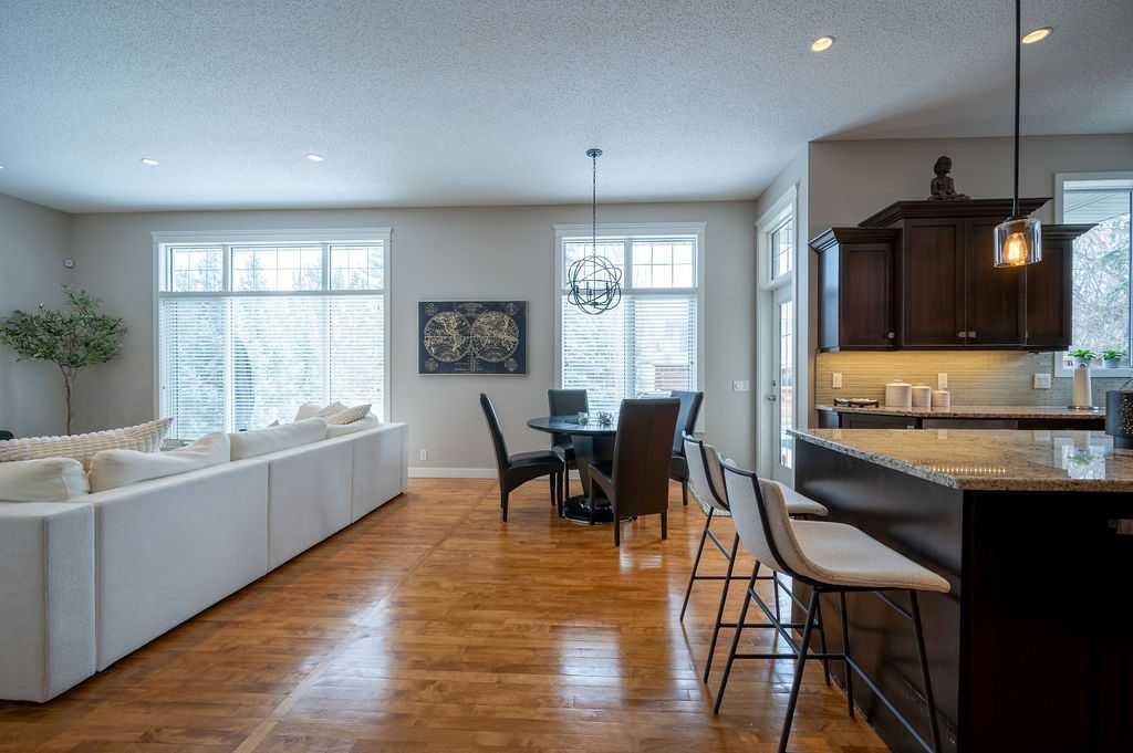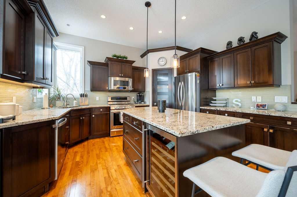 Tucked away on a quiet cul-de-sac in the highly sought-after community of Mountain Park, this fully developed bungalow delivers the kind of space, style, and comfort that’s hard to come by. With over 2,800 sq ft of beautifully finished living space, this home makes an impression before you even step inside—gorgeous curb appeal that hints at everything waiting for you within. Open the door and it all comes together. Soaring 10’ ceilings, rich hardwood floors, and modern lighting create a bright, elevated feel throughout the main level. The layout flows effortlessly from a dedicated dining space—perfect for hosting—to an open-concept kitchen and living area designed for everyday living. The kitchen doesn’t miss. Granite countertops, updated stainless steel appliances, ample cabinetry, a corner pantry, and under-cabinet lighting set the tone, while the breakfast nook leads you straight out to a custom-built deck—morning coffee just hits different out here. The living room is warm and inviting, anchored by a gas fireplace with stone surround and wood mantle, oversized windows, and built-in speakers that make it just as perfect for quiet nights as it is for entertaining. The primary suite feels like a true retreat, complete with a 5-piece ensuite featuring dual sinks, a jetted tub, separate shower, and a walk-in closet that actually delivers on space. Main floor also offers a flexible second bedroom or office, a full 4-piece bathroom, and a functional mudroom with custom built-ins and front-load laundry—because the little details matter. Downstairs, the fully developed basement opens up even more possibilities. With engineered hardwood flooring, a second living area for movie nights, a spacious rec room for a gym or games setup, two additional bedrooms, a 3-piece bathroom, and a dedicated office, this level adapts to whatever your life looks like. Out back, you’ve got room to breathe—plenty of space for kids, pets, or just enjoying a quiet evening in your own yard. Homes like this don’t just check boxes—they raise the bar. And once you walk through it, you’ll feel exactly why.