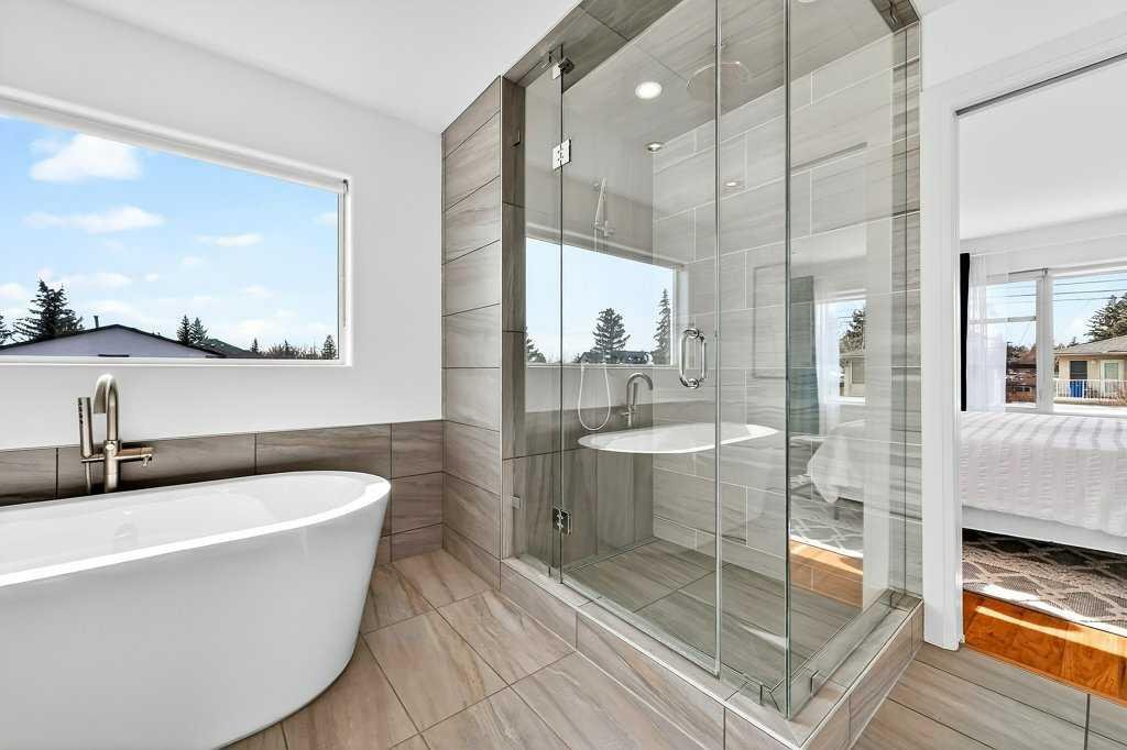 Welcome to this exceptional luxury infill in the desirable inner-city community of Glenbrook, offering over 3,000 sq ft of developed living space with 4 bedrooms and 5 bathrooms on a large corner lot with sunny south and west backyard exposure that fills the home with natural light throughout the day. The open-concept main floor is designed for both everyday living and entertaining. The stunning chef’s kitchen features high-end stainless steel appliances including a gas cooktop, extensive contemporary cabinetry, a marble backsplash, and a massive quartz island with waterfall edge and double-thick edge detail. The bright living room overlooks the backyard and is anchored by a sleek linear fireplace, creating a warm and inviting space. Walnut hardwood flooring runs throughout nearly the entire home, including the upper levels and basement living areas. The second floor offers three bedrooms, a full bathroom, convenient laundry, and mountain views. The spacious primary suite features a walk-in closet with built-ins and a spa-inspired ensuite with heated floors, double vanity, glass shower, and deep soaker tub beside a large window that fills the room with natural light. The entire third floor is a standout entertaining space, offering a bright and versatile lounge area complete with a wet bar, beverage fridge, and 2-piece bathroom. Step outside to the private balcony with gas hookup, perfect for relaxing or entertaining. The professionally developed basement includes a large recreation area with built-in wet bar, a fourth bedroom, and a full bathroom, along with in-floor slab heating for year-round comfort. Additional highlights include a double detached garage with 220V outlet for EV charging. Ideally located close to parks, schools, restaurants, and shopping at Westhills and Signal Hill Centre, with quick access to Richmond Road and Sarcee Trail and approximately an 8-minute commute to downtown Calgary.