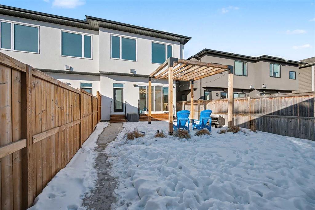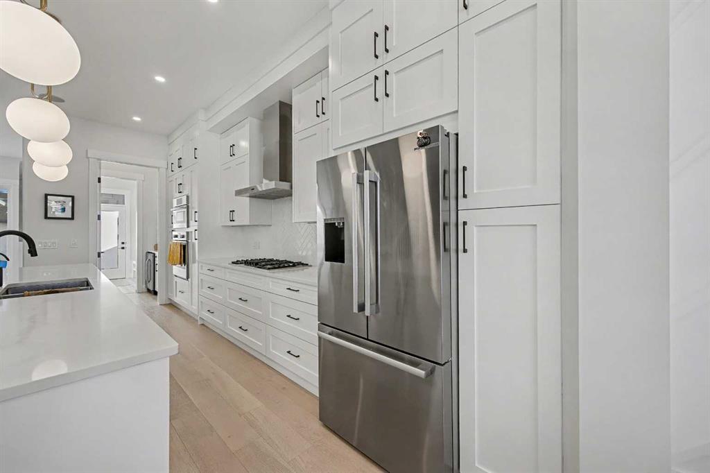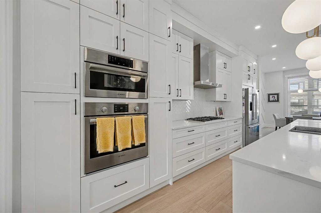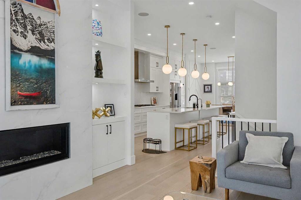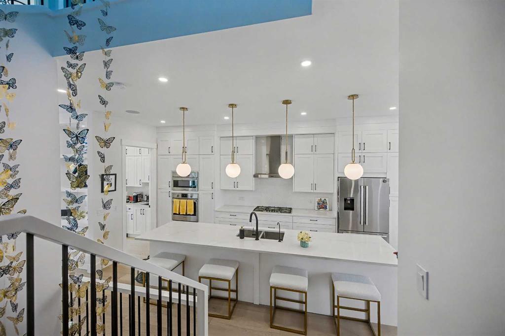 The GOURMET kitchen is a chef’s DREAM, complete with a massive waterfall ISLAND with ample seating, STAINLESS STEEL appliances, QUARTZ countertops, BUTLER’S PANTRY, plenty of cabinets and counter space, and a large dining area. The spacious living room features a cozy 2 way gas FIREPLACE. The patio door leads to your fenced backyard complete with a PATIO.