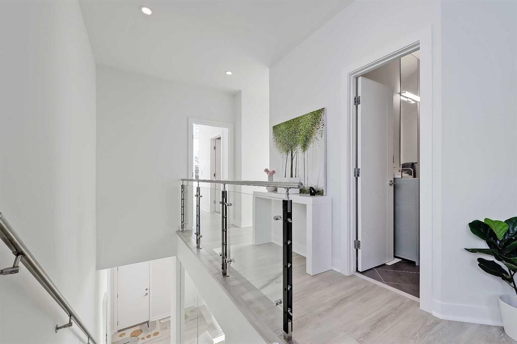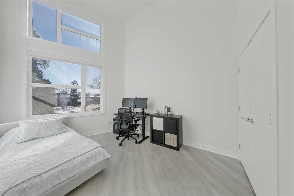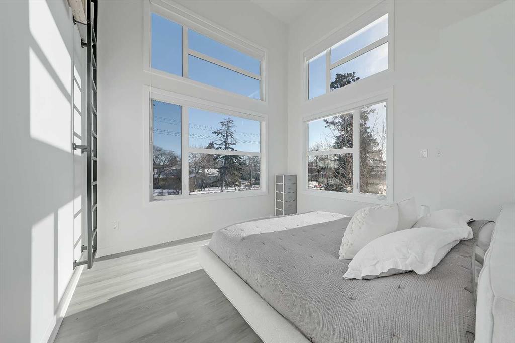 Welcome to this rare end unit fronting green space. This highly upgraded Bordo townhome showcases over 2,300 sq ft (over 1,700 sq ft above grade), soaring ceilings, a private fenced yard, a fully developed basement, and a rare attached insulated garage. This home delivers the comfort and scale of a detached home with the ease of low-maintenance inner-city living. The bright main floor features 10-ft ceilings and expansive windows that fill the space with natural light. The contemporary, warm living room has a massive window overlooking the adjacent green space. It centres on a tiled feature wall with a gas fireplace and is enhanced by built-in ceiling speakers. The rear kitchen anchors the layout with a quartz waterfall island and counters, a sleek glass backsplash, stainless steel appliances including an induction cooktop, a dual-basin undermount stainless steel sink, a discreet hood fan, and ample high-end cabinetry. A powder room and a mudroom with direct access to the attached garage add everyday functionality. Upstairs, the primary suite impresses with 16.6-ft ceilings, oversized windows, a large walk-in closet, a bonus loft, and a spa-inspired 5-pc ensuite featuring heated tile floors, a dual-sink vanity with quartz and storage, a soaker tub with tile surround, and a fully tiled stand-up shower with 10mm glass door. A second bedroom with 14.5-ft ceilings, a full 4-pc bathroom, a versatile bonus room, and a convenient upper-floor laundry closet complete the upper floor. The fully developed basement features 9-ft ceilings, a spacious rec room, plus a third bedroom and a full bathroom—ideal for guests or for use as a home office. Mechanical upgrades include a high-efficiency furnace, humidifier, and HRV system. Enjoy a private fenced yard with a gas line for a BBQ, plus immediate access to the large green space outside the door. Located in the heart of Renfrew, just minutes to downtown, 16 Ave, Edmonton Trail, Deerfoot Trail, schools, parks, shopping, Calgary Zoo, and the Renfrew Aquatic Centre, this home offers outstanding inner-city convenience. Schedule a private showing today!
