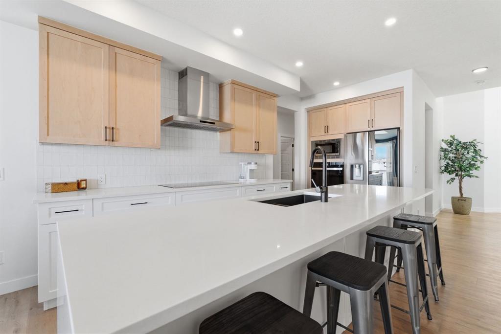 A striking open-to-above foyer creates an exceptional first impression, leading into a beautifully appointed and expansive open concept main floor. At the heart of the home is Sterling’s Executive Chef’s kitchen, expertly designed with full-height cabinetry, extensive drawer and cabinet storage, a waterfall island, premium appliances (including an induction cooktop and LG Smart refrigerator), a Silgranit sink, and a walk-through pantry—blending everyday function with upscale design. The open-concept living and dining areas are ideal for entertaining, with extra large windows and 8’ sliding patio doors that invite in natural light and connect seamlessly to the views of Cochrane. The main floor is complete with a private office and a highly functional mudroom featuring custom built-ins, a walk-through pantry, and an extra-large walk-in closet.
