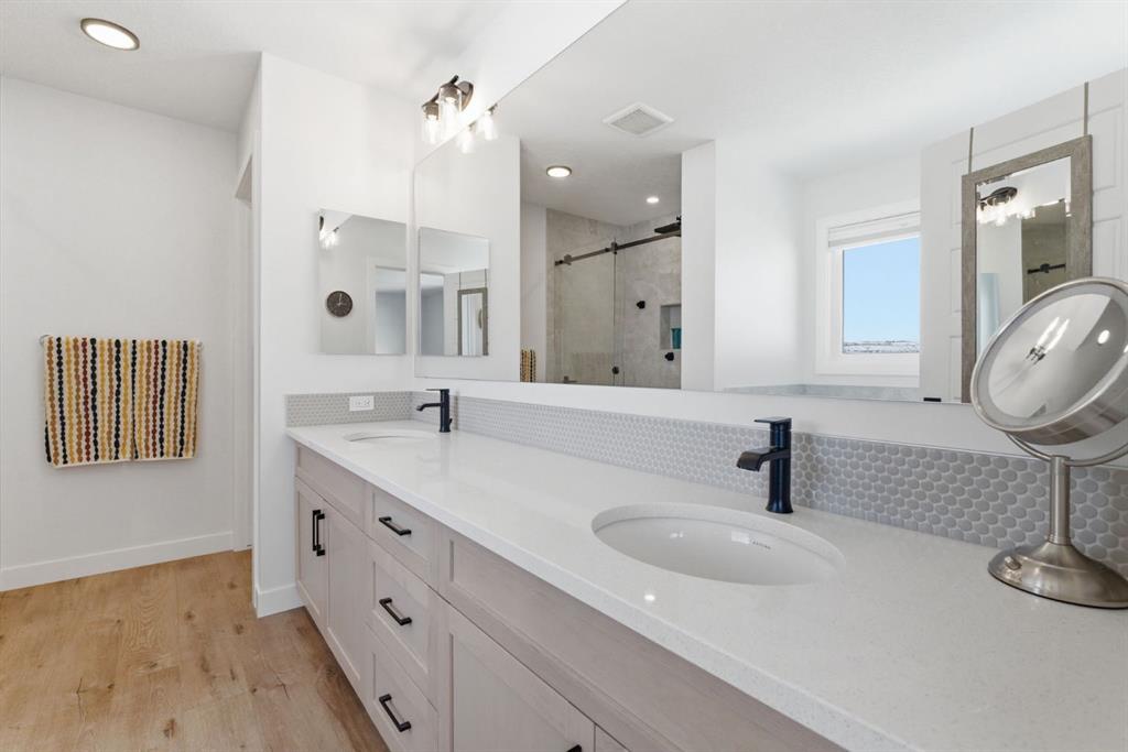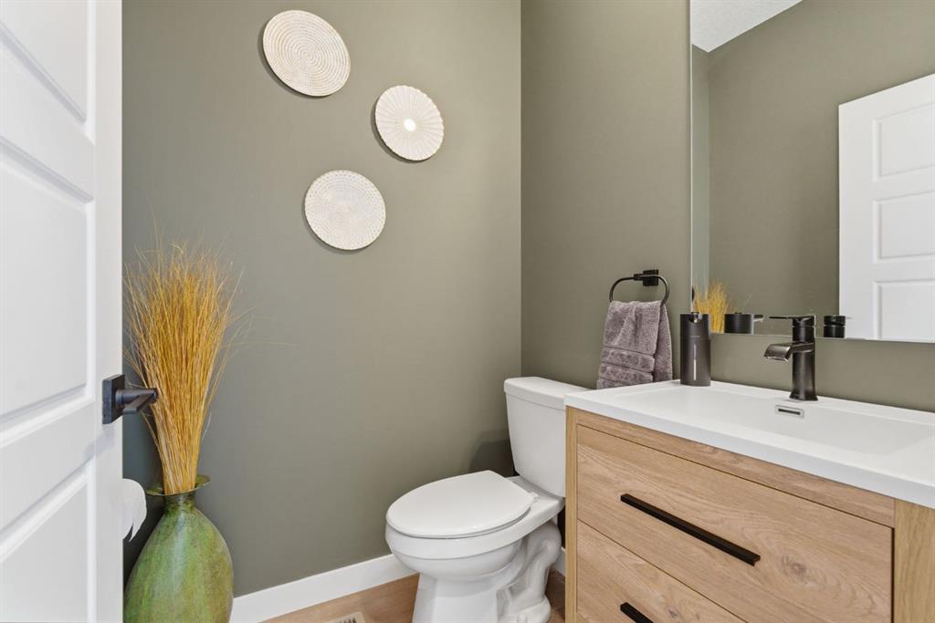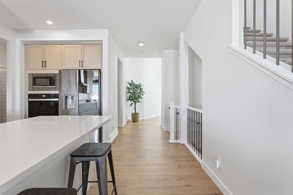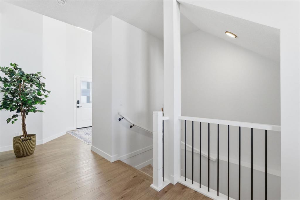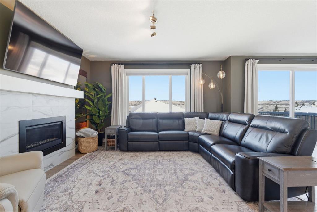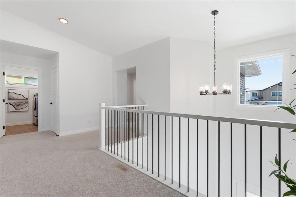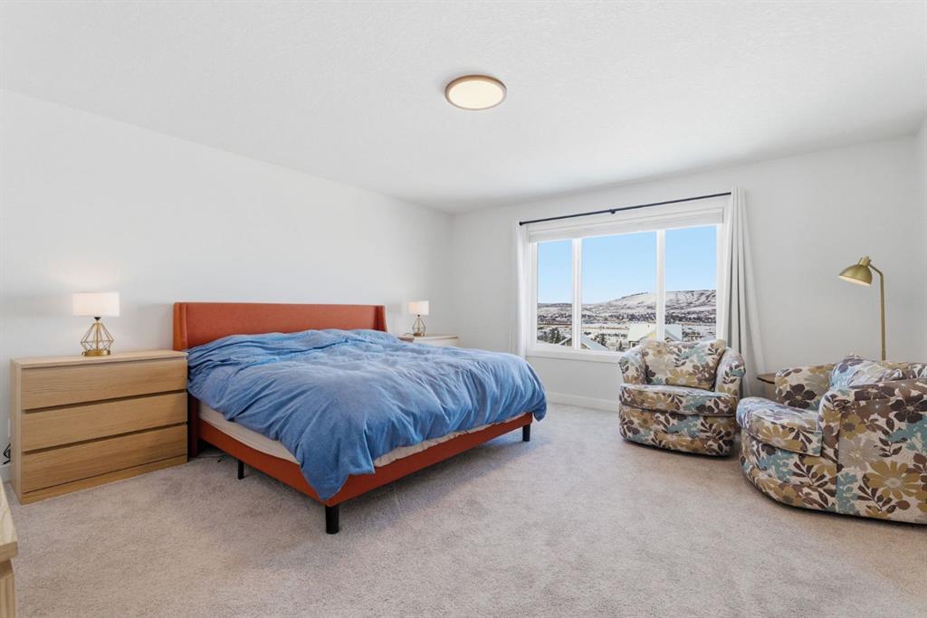 Upstairs, a very generous vaulted bonus room provides an elegant retreat, while 4 spacious bedrooms offer flexibility for families of all sizes. The primary suite is a true sanctuary, capturing stunning views of Cochrane. It is complemented by a luxurious 5-piece ensuite with dual vanities and extra drawer space for storage, a tiled walk-in shower with dual shower heads, soaker tub, a private water closet, and a generous walk-in closet. A 4-piece bathroom and a full-size laundry room with Samsung SmartThings Washer and Dryer, upgraded with risers finish off the 2nd level.