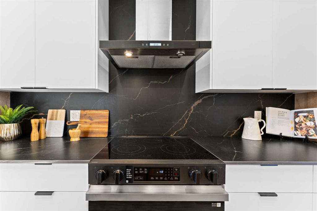 The open-concept main floor impresses with 9’ ceilings, large windows, designer lighting, and warm wood accents. The chef’s kitchen features quartz countertops, premium stainless-steel appliances, backsplash, and a stunning island perfect for entertaining. Enjoy cozy evenings in the spacious living room.