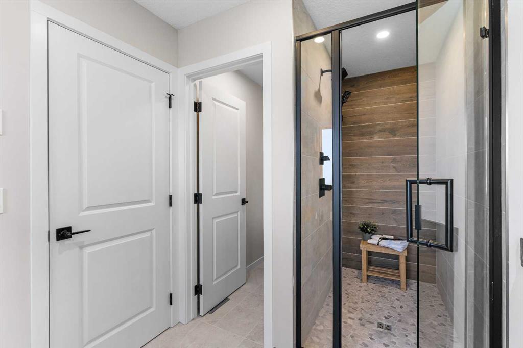 Upstairs, the primary suite is a true retreat with a feature wall, walk-in closet, and spa-inspired ensuite with a freestanding soaker tub and rain shower. Two additional bedrooms, a stylish bathroom, and upper laundry complete this level.